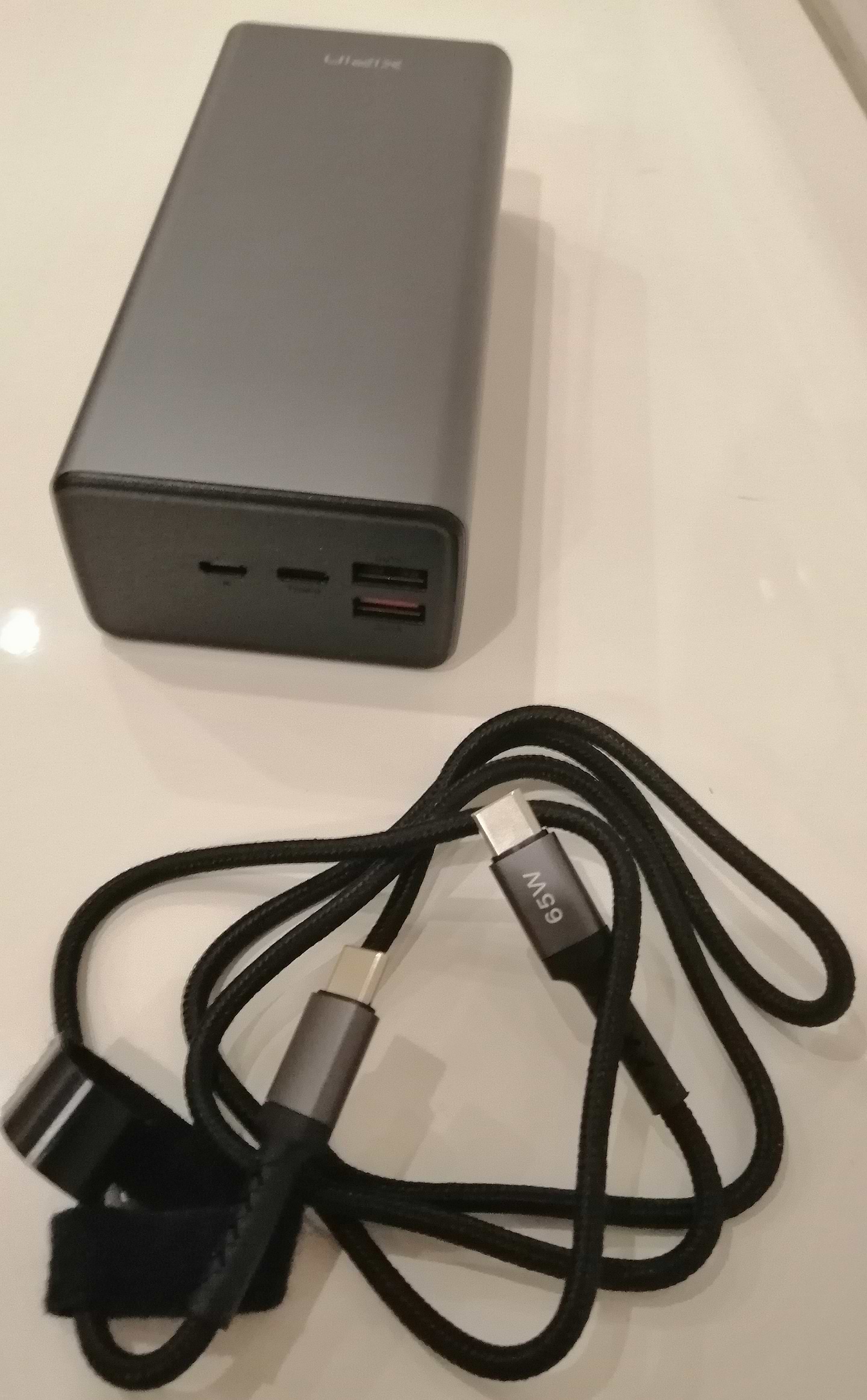 Чудовий потужний(65W) powerbank з технологією PD. В комплекті є досить довгий кабель Type C - Type C, що підтримує швидку зарядку. Купував для живлення роутера 12V. Окремо придбав адаптер Type C - DC,все працює. Рекомендую!
