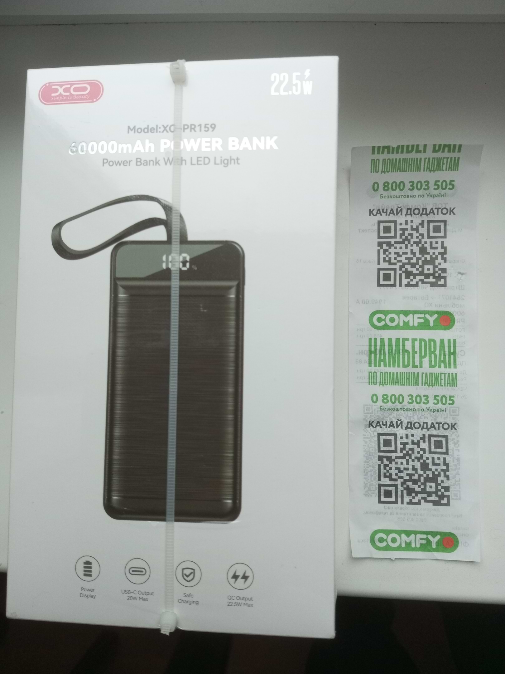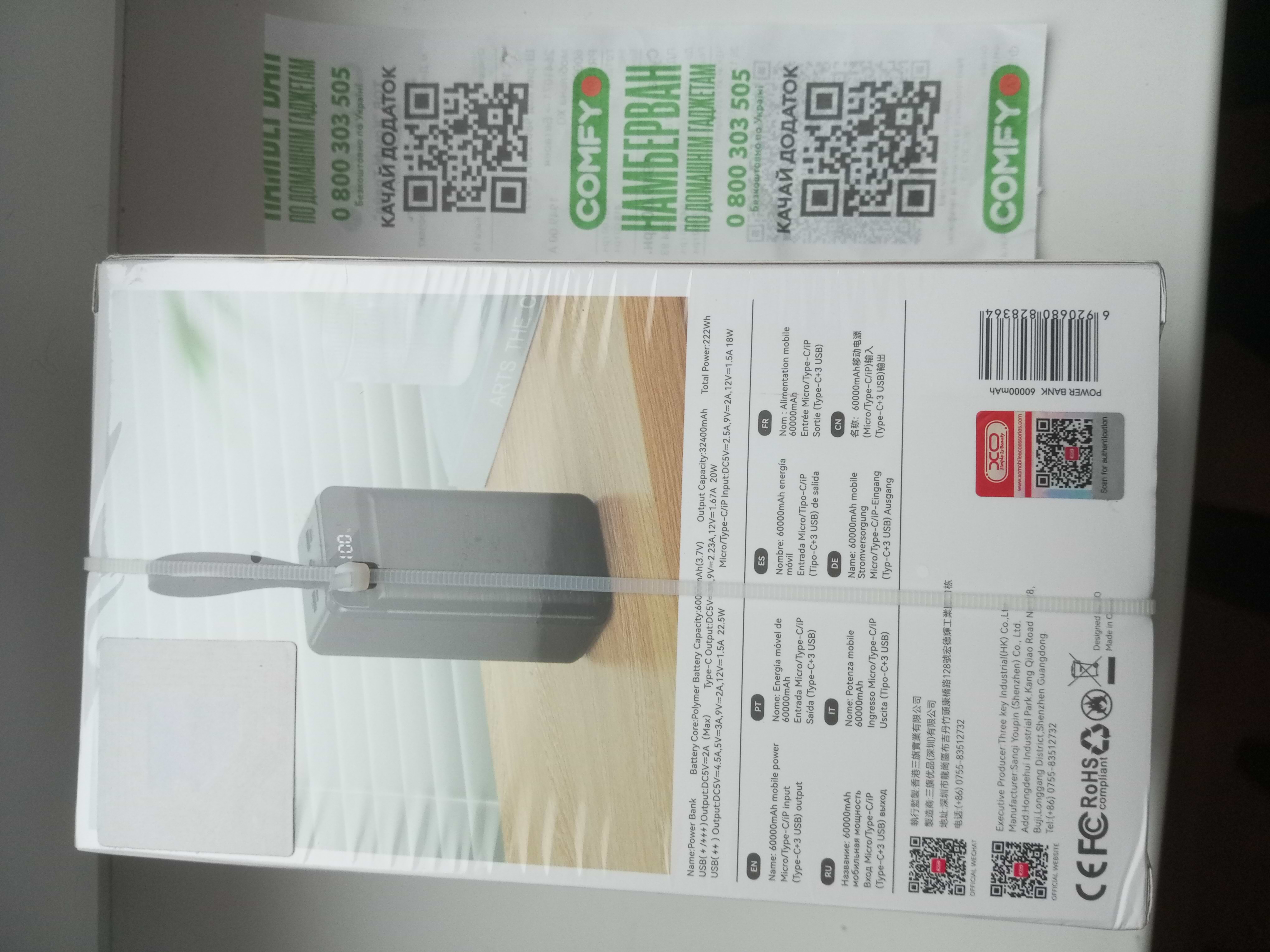 Нормальний повербанк по хорошій ціні. З коробки заряд становив 79%. Запакований якісно. Інструкції як такової немає на Українській мові, тільки на англійській і китайській. Я його купив із-за ліхтарика, який до речі непогано світить, але не дуже яскраво, як каганець або нічник цілком підійде для дому та квартири, щоб вночі в темряві не натикатися на різні предмети. Важкенький - 1,3 кг. Велика ємність 60 тисяч мАг, потужність 22,5 ватт. 6 роз'ємів має, з них три USB. Як покаже себе в роботі, побачимо. Зразу поставив на ніч на зарядку. Цілком достойний повербанк. Зробіть собі невеличкий подарунок в наші сірі, темні вечори без світла.