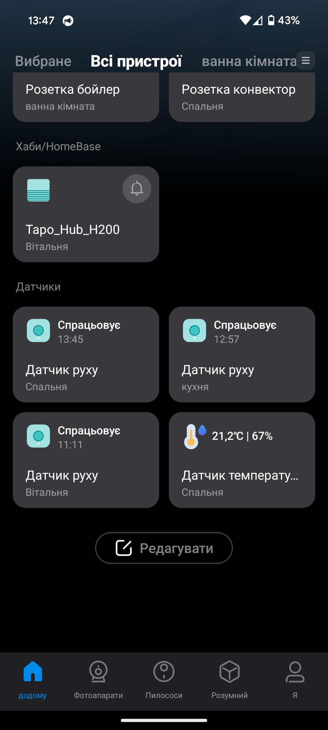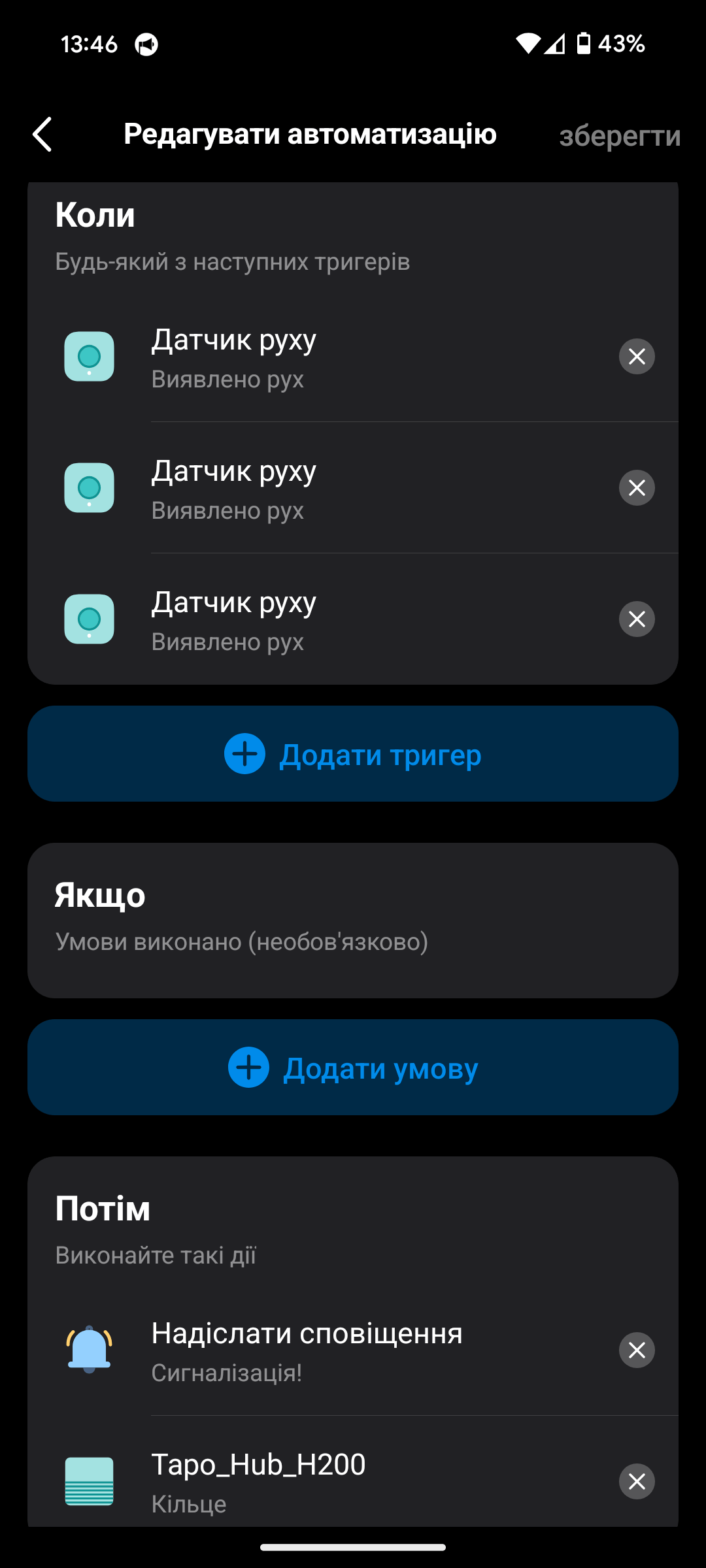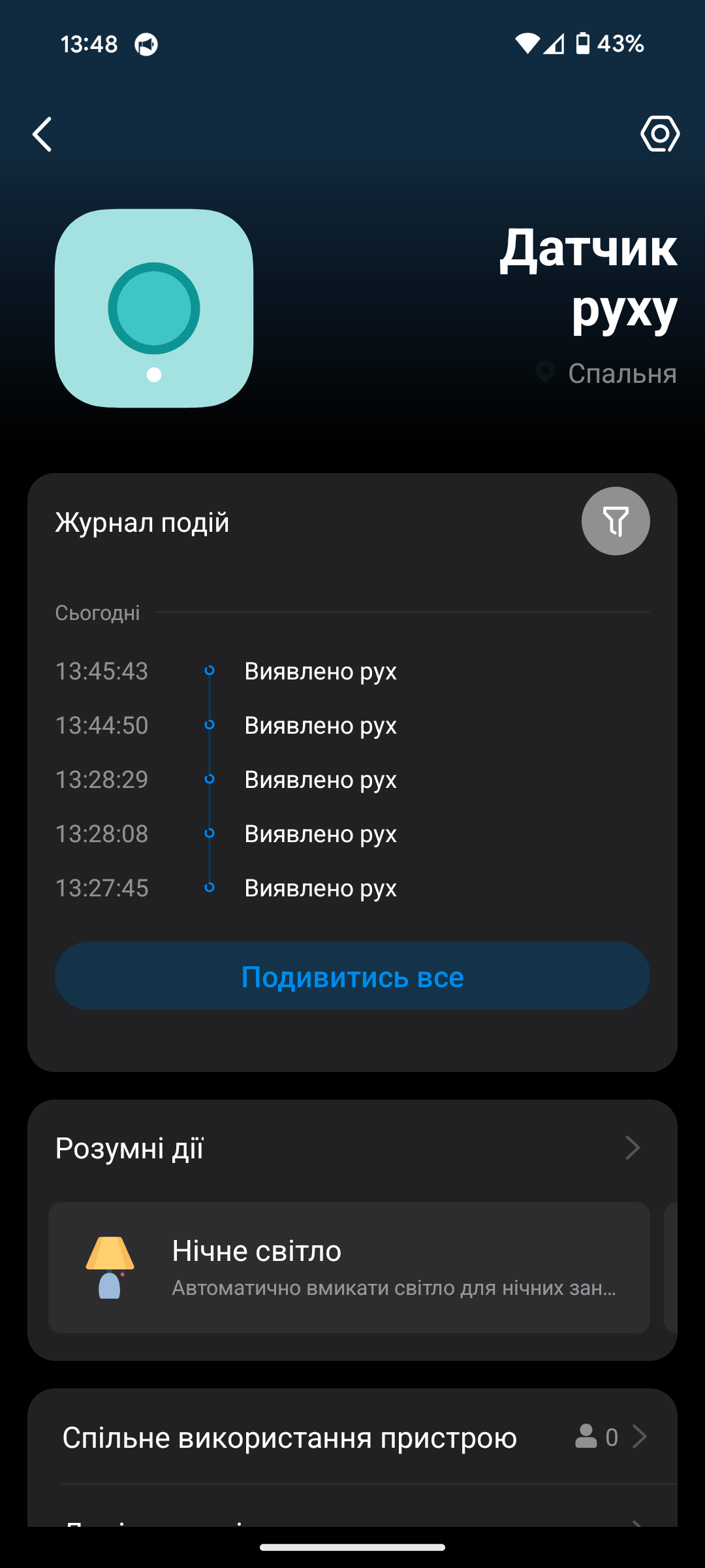 Особливо зручно вночі: налаштовано сценарій, що з 00:00 до 05:00, коли хтось прокидається, датчик автоматично вмикає світло на знижену яскравість. Це дуже комфортно — не сліпить, але й не треба наосліп шукати вимикач.