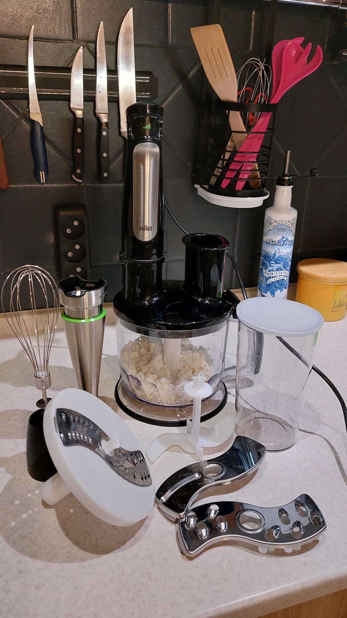 Блендером дуже задоволена, зі своїми задачами він справляється на ура. Це вже мій другий блендер в користуванні майже пів року. Перший теж Браун і прослугував 14 років. Нова модель більш продумана. Насадкі то взагалі топ, дерунчики виходять смачнючі. Велика чаша, зручно і тісто замішати і подрібнити. Венчік дійсно не розбризгує тістл як заявлено.