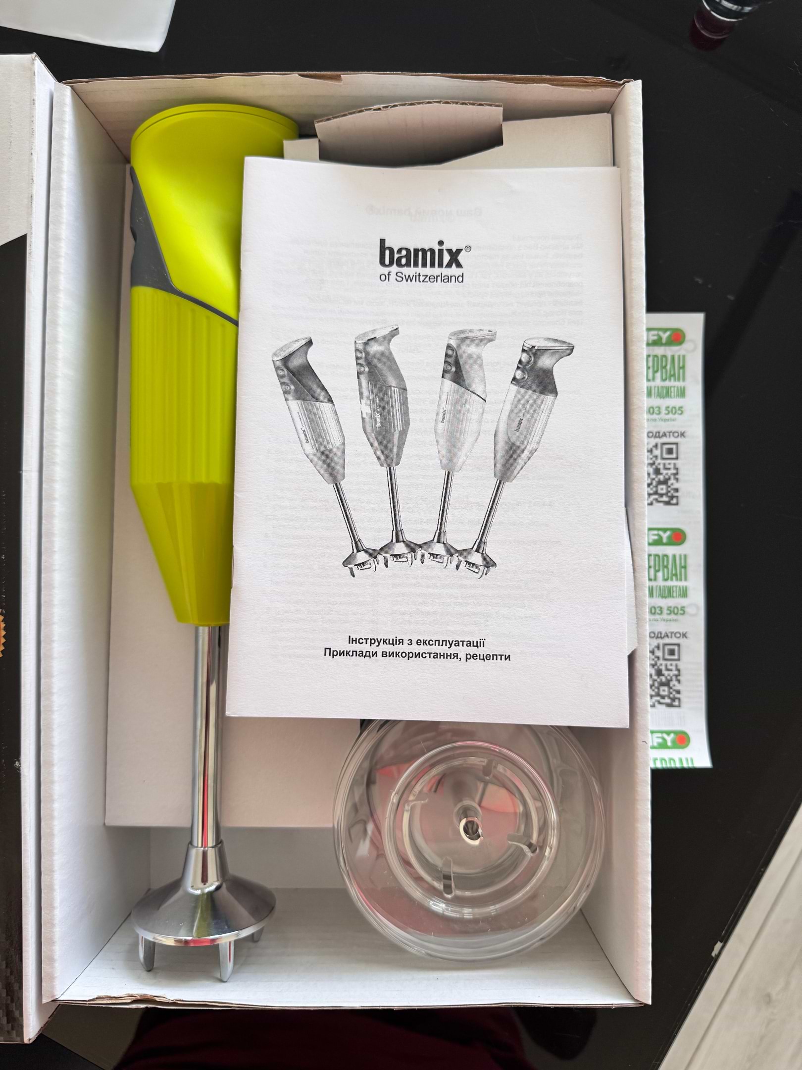 Швейцарська якість! Приємний на дотик якісні матеріали. Приємно працювати, компактний для зберігання! Є можливіть докупити окремо насадки чи аксесуар для нарізки овочей. Блендер топчик! Рекомендую, вартий своїх коштів!