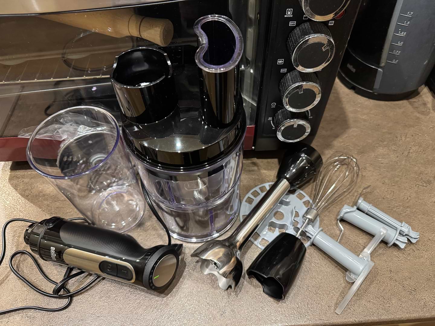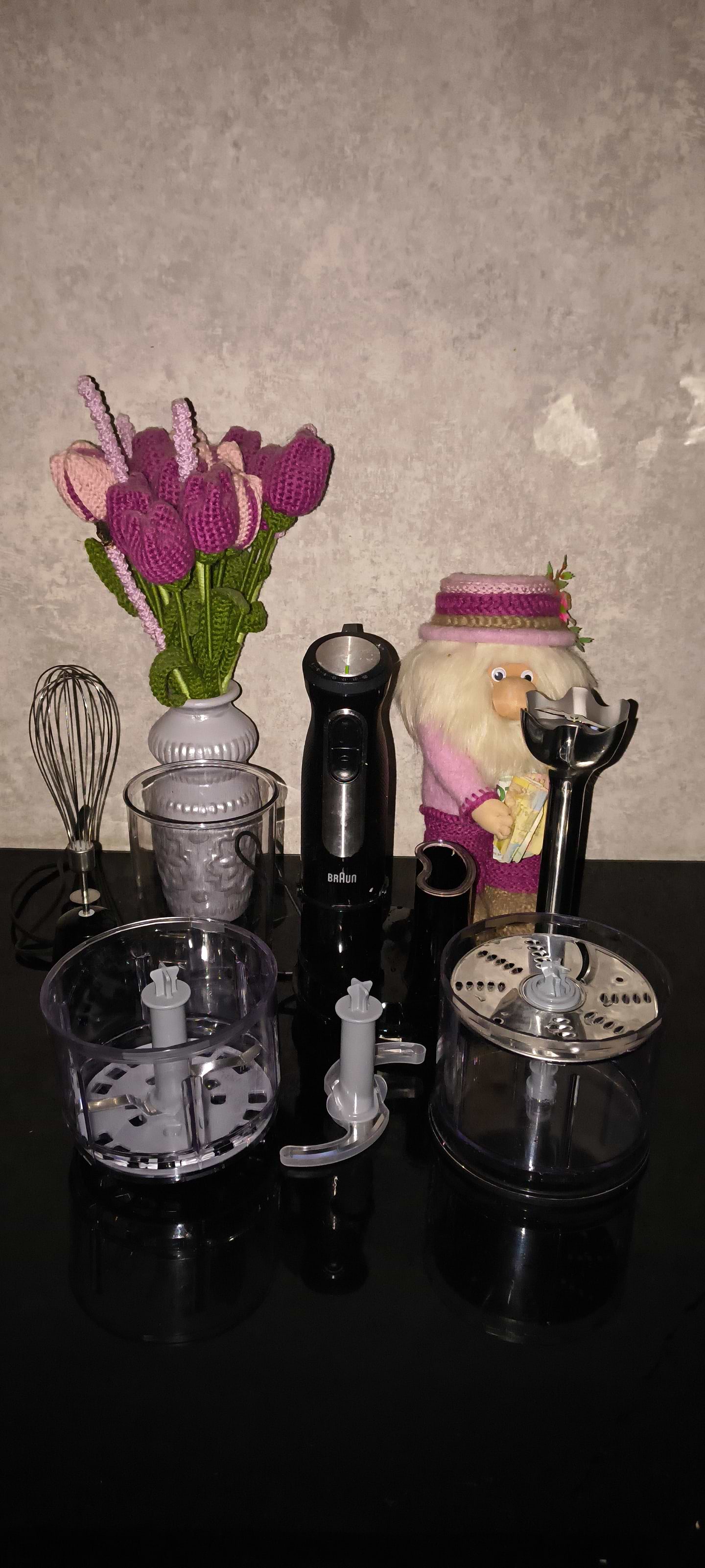 Хороший, добротний блендер, Браун є Браун. Попередній блендер Браун прослужив 18 років, на заміну купила цей. Насадку для нарізки ще не використовувала, але при використанні подрібнювача було не дуже зручно, бо кришка одна і для нарізки і для подрібнення зі штукою для проштовхування, вона заважала і довелось мити і сушити зайві деталі.