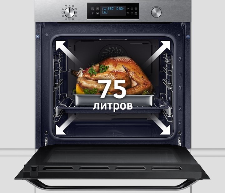 Вместительность духового шкафа Samsung NV75K5541R можно назвать выдающейся – объем в 75 литров позволит вам загрузить туда самые крупные виды блюд. Любые праздники, грандиозные мероприятия – в таком большом пространстве вам удастся запечь все что угодно.
