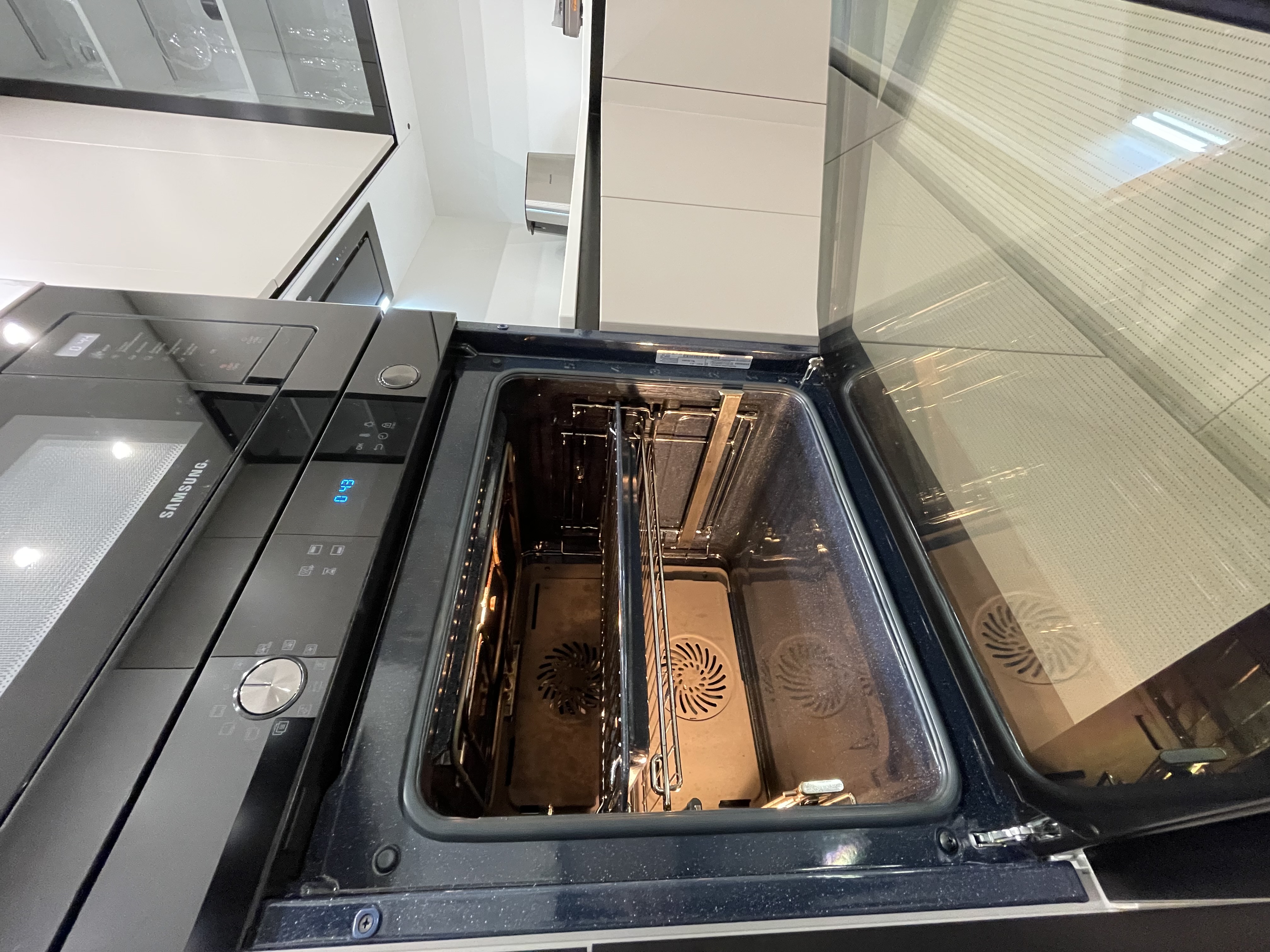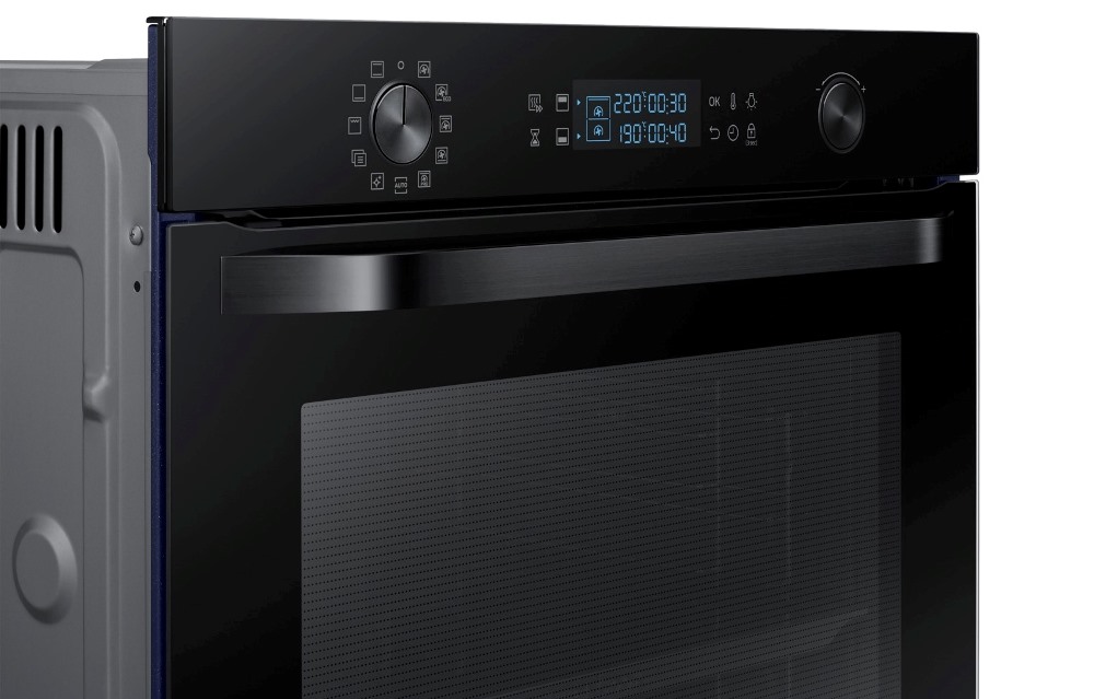Одной из инновационных возможностей духового шкафа Samsung NV75K5541R является разделение внутреннего пространства на две независимые зоны. Каждый раз, когда у вас возникает необходимость готовить небольшое блюдо, которому достаточно места лишь в одном отсеке, вы можете использовать только его. Даже при одновременном приготовлении различных по вкусовым качествам блюд в обеих камерах духового шкафа вы можете задать разные программы для них и не переживать, что запах рыбы, например, смешается с ванильно-коричным ароматом печенья. Ну а при необходимости запечь большую индюшку или же кастрюльку с другими продуктами внутренние пространства духового шкафа Samsung NV75K5541R объединяются в одно цельное и это позволяет готовить как в обычной духовке.