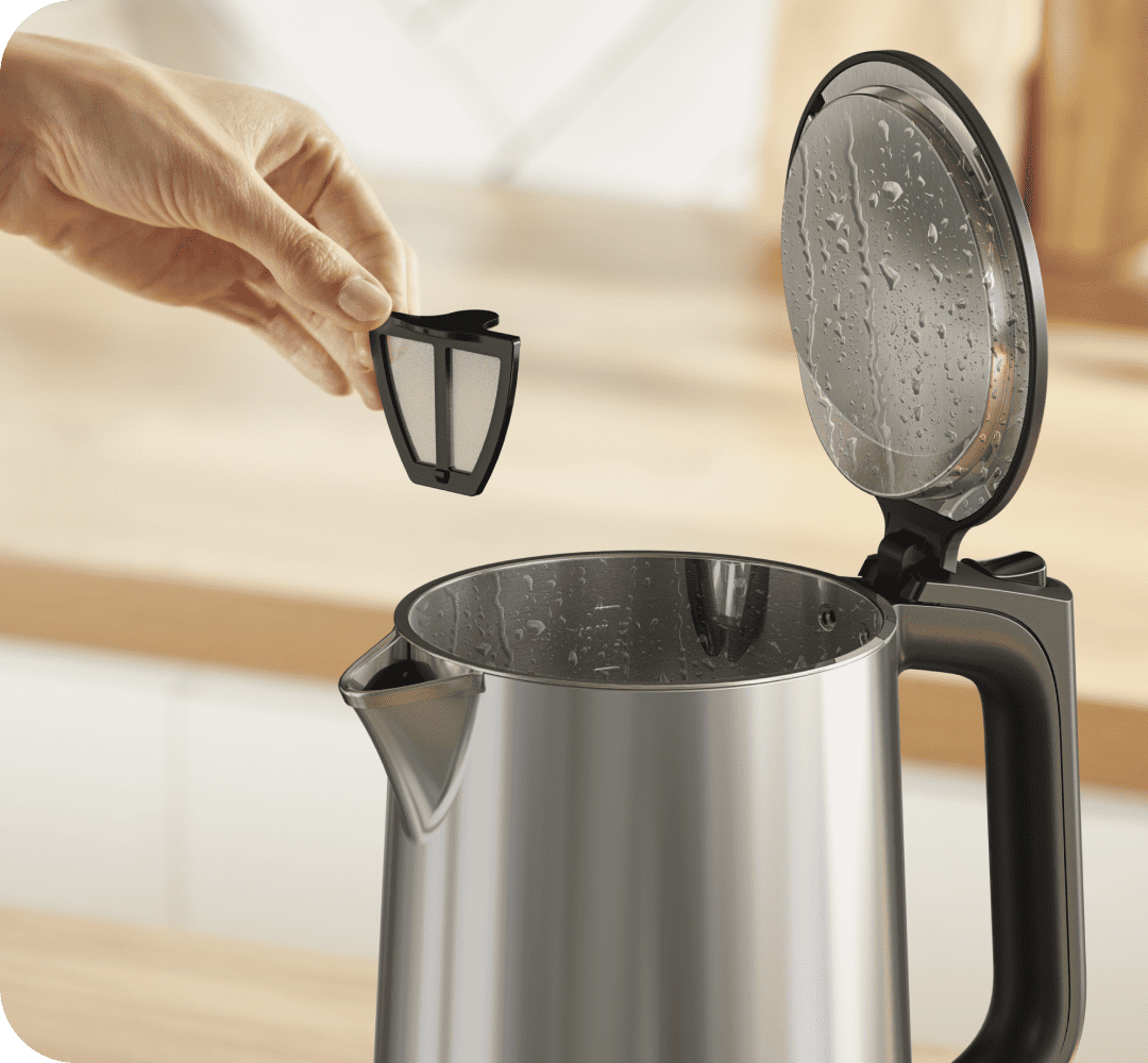 Крышка с откидным механизмом легко открывается, однако она не упадет, когда вы наливаете кипяток. Съемный фильтр легко промывать от накипи, которая всегда будет от кипячения любой воды.