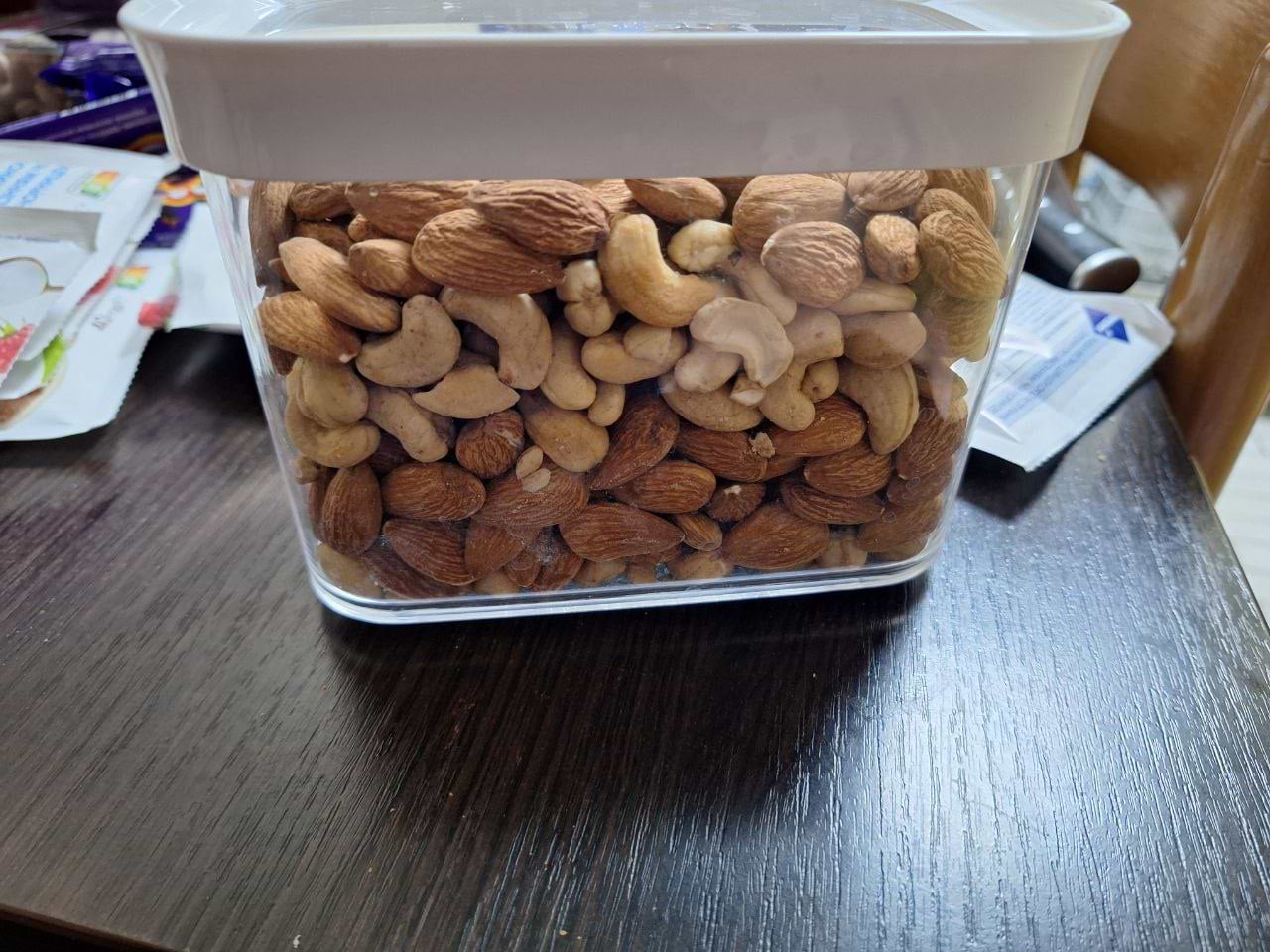 Завжди маю запас корисного перекусу, а зберігати його краще за все у контейнерах Тефаль. Можна засипати 2-3 пакування різних горіхів, вони компактно стоять на полиці і не розсипаються, як з магазинним пануванням.
