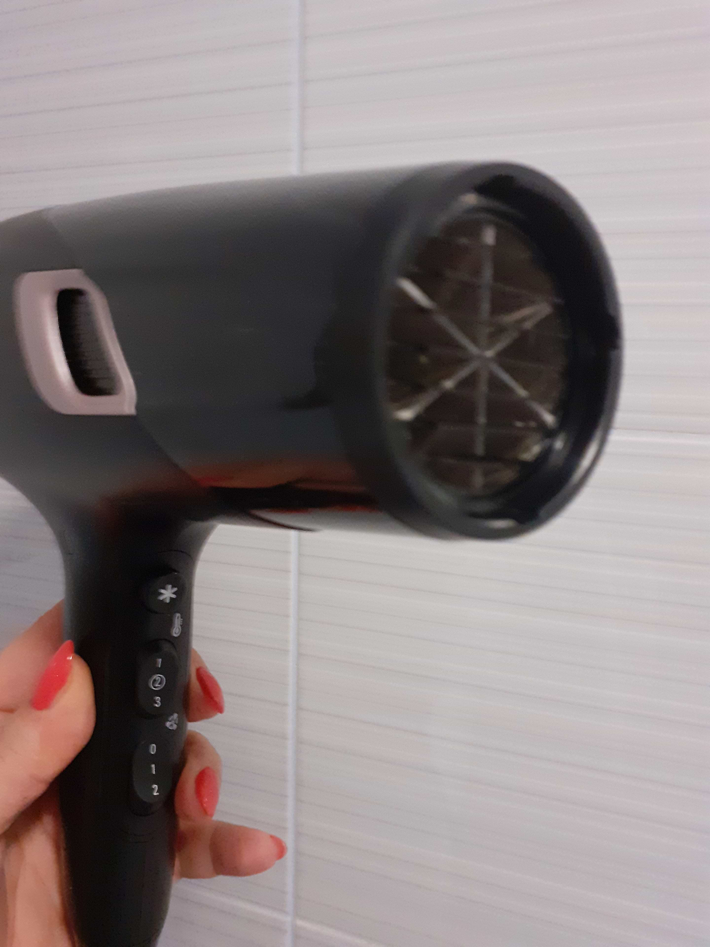 Давно присматривала какую выбрать модель фена но остановиться решила на этой модели тихо работает , удобно держать в руке не перешагивает волосы