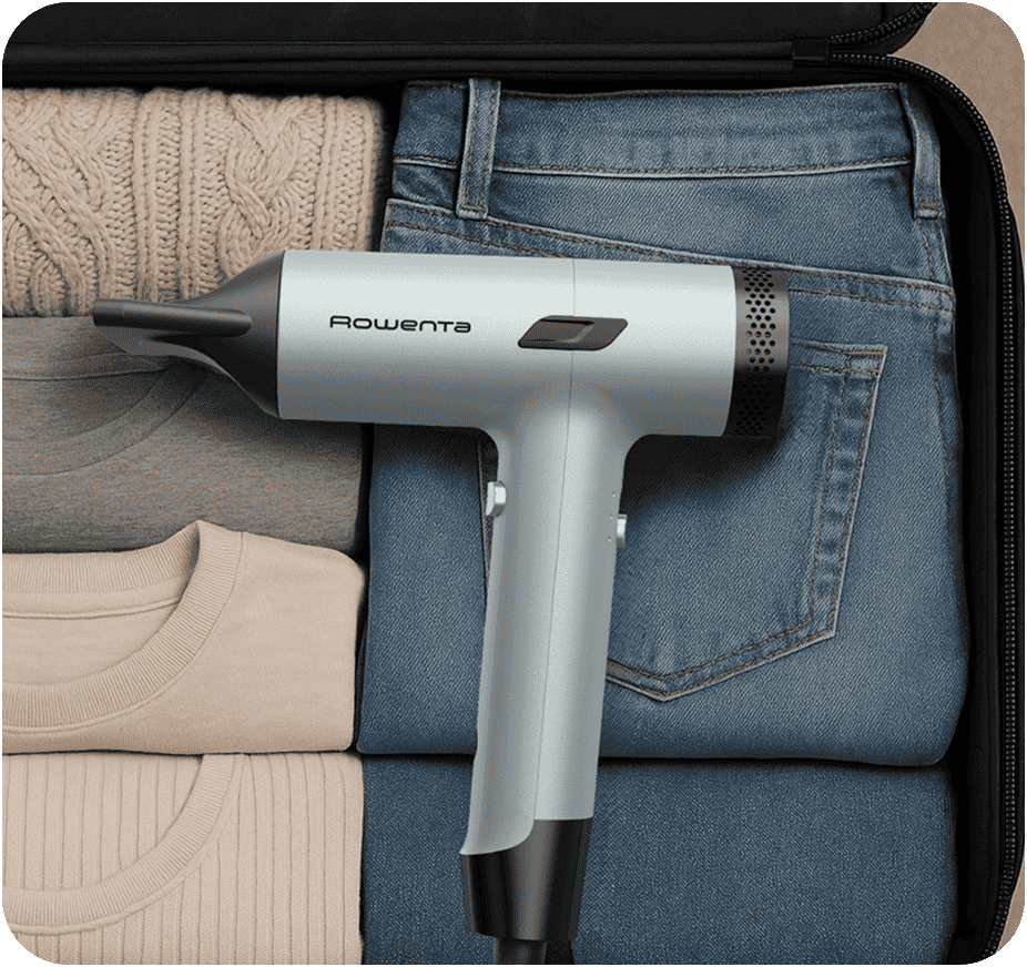 Этот суперкомпактный фен поместится в любую сумку, так как он меньше на 60%*, а это значит, что его всегда можно взять с собой.