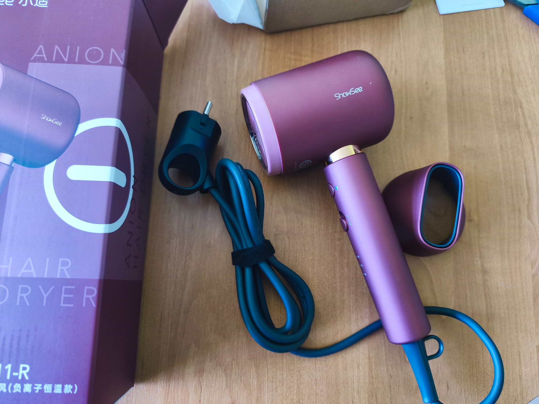 Фен красивый, по мощности тоже нормальный (голову еще не сушила), не очень громкий, насадка магнитная, в руке удобный и не тяжелый.