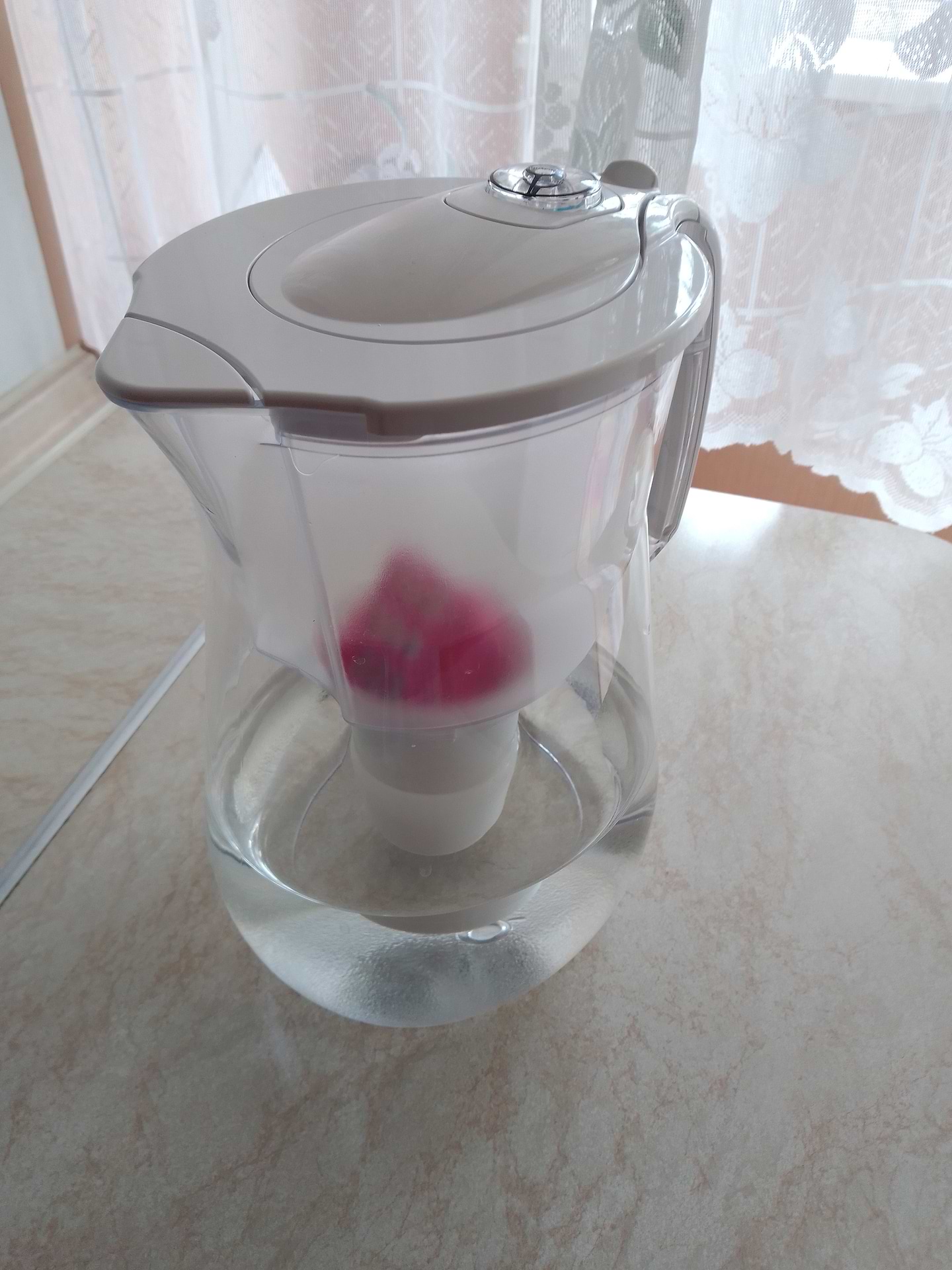 Вода після фільтрації має нейтральний смак, накіп в чайнику відсутній. Є також зручний механічний лічильник ресурсу фільтруючого елемента, працює від кількості відкривань та закривань кришки глечика.
