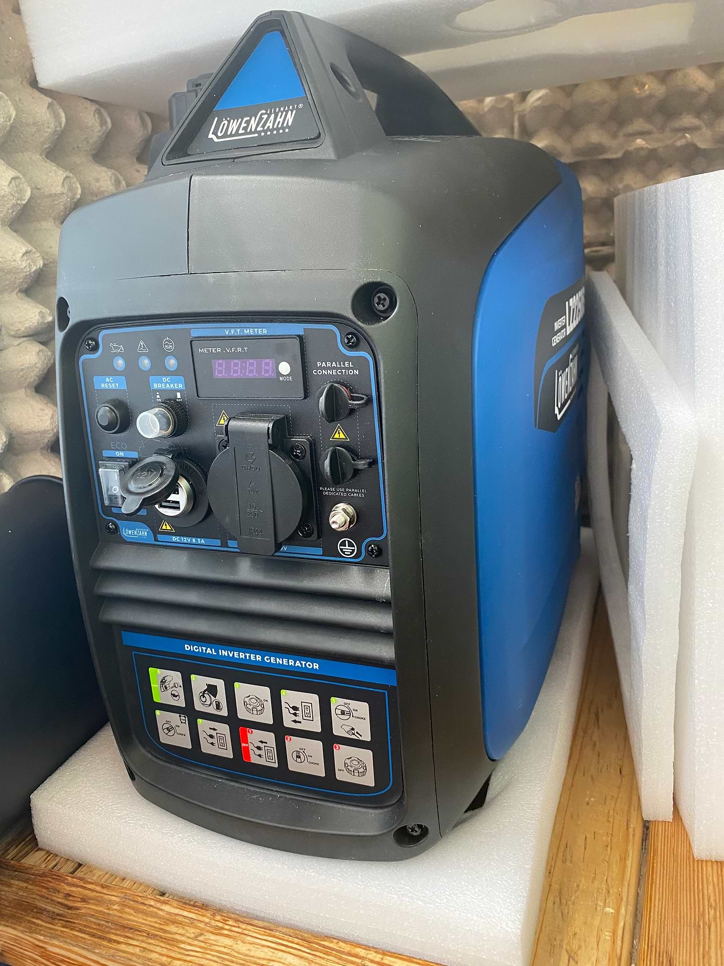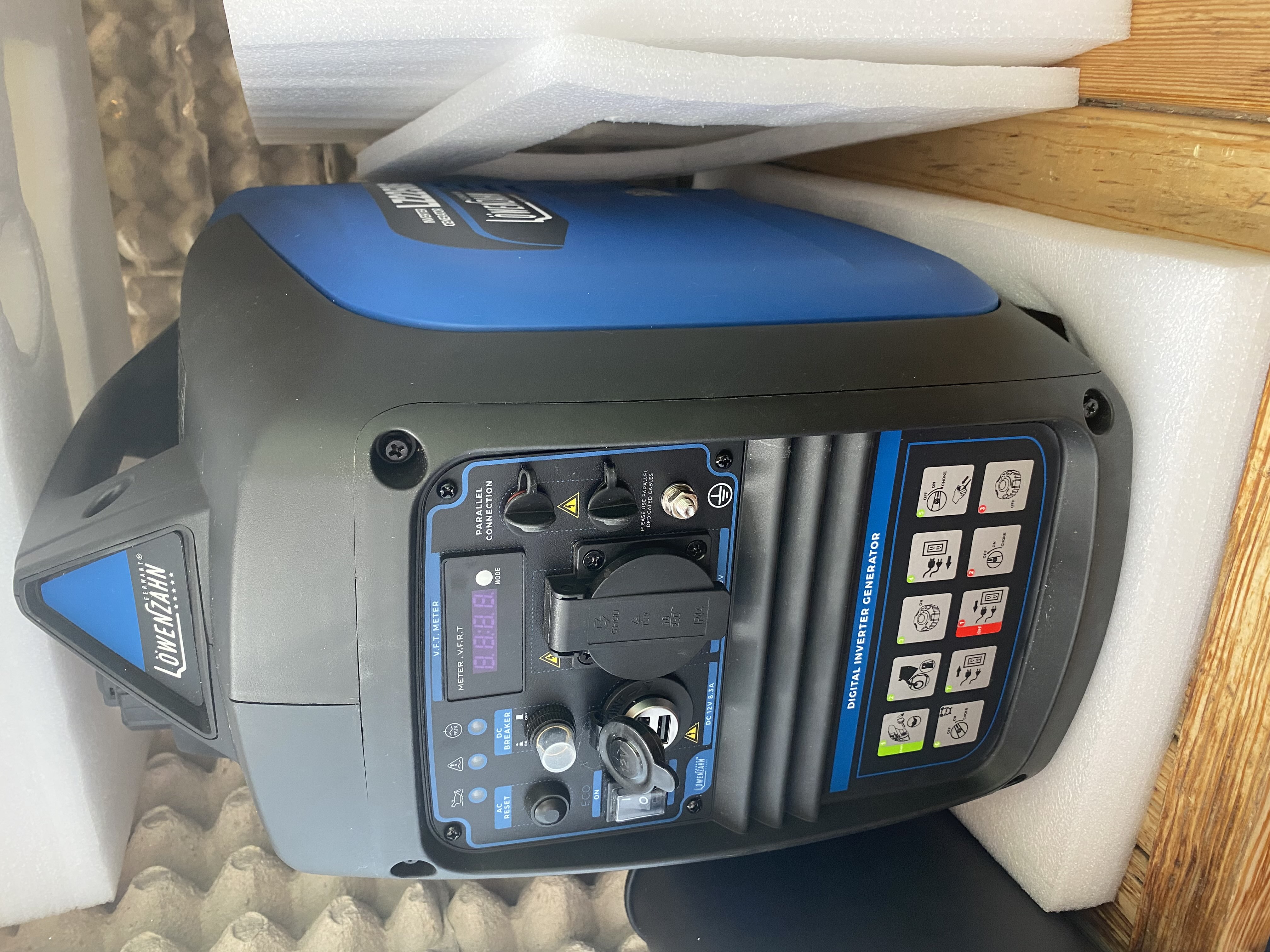 Решил написать отзыв о генераторе LoweNzahn LZ2250iS, так как отзывов о данном генераторе я не нашел. В первую очередь меня привлекла цена. Аналогичные генераторы стоят в районе 17-18 тыс. Особенно порадовало наличие дисплея, который отображает: вольтаж – частоту – моточасы текущего запуска – моточасы общие. Счетчик моточасов очень полезен, так как техническое обслуживание привязано к моточасам. Индикация: «низкий уровень масла», «неисправность» и «работа». В комплекте гарантийный талон, инструкция, свечной ключ, отвертка, переходник на 2 USB в разъем 12 В. Корпус генератора выполнен качественно. Завел не с первого разу, но благо есть опыт работы с карбюраторным двигателем. Завел. Последующие запуски были с пол оборота, так сказать. Генератор обкатал на холостых