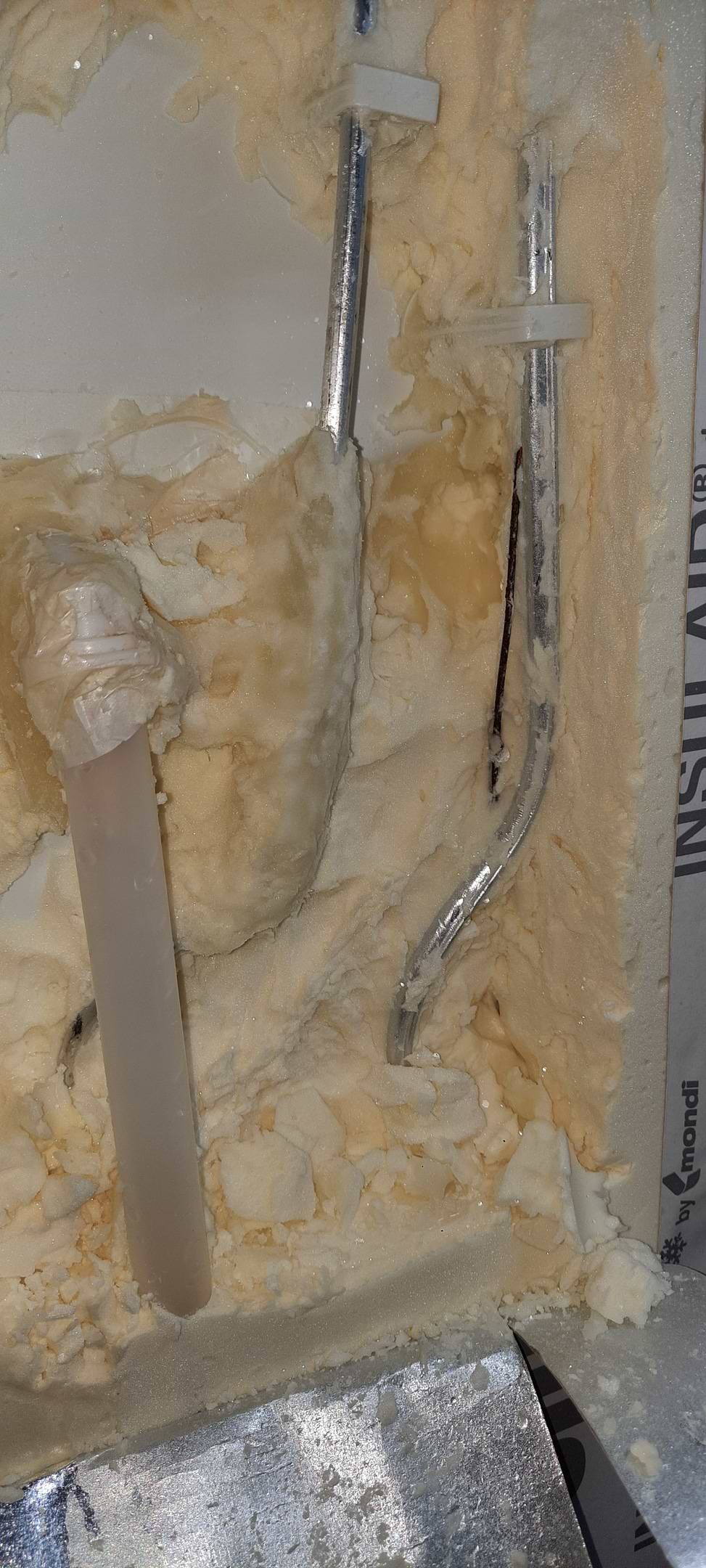 Обмерзание изоляционной пены возле сливного отверстия, по причине рядом расположенной трубки с фрионом.