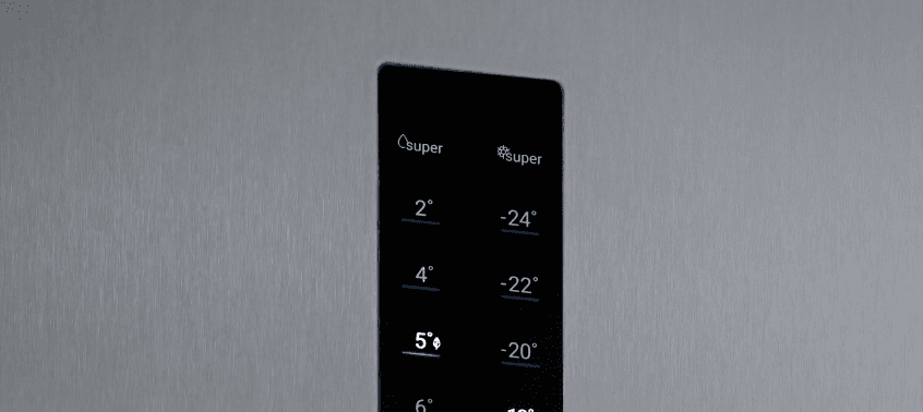 Нулевой зазор открывания дверей. Благодаря этому можно ставить холодильник вплотную к стене и открывать дверь на 90°, при этом ящики выдвигаются беспрепятственно.