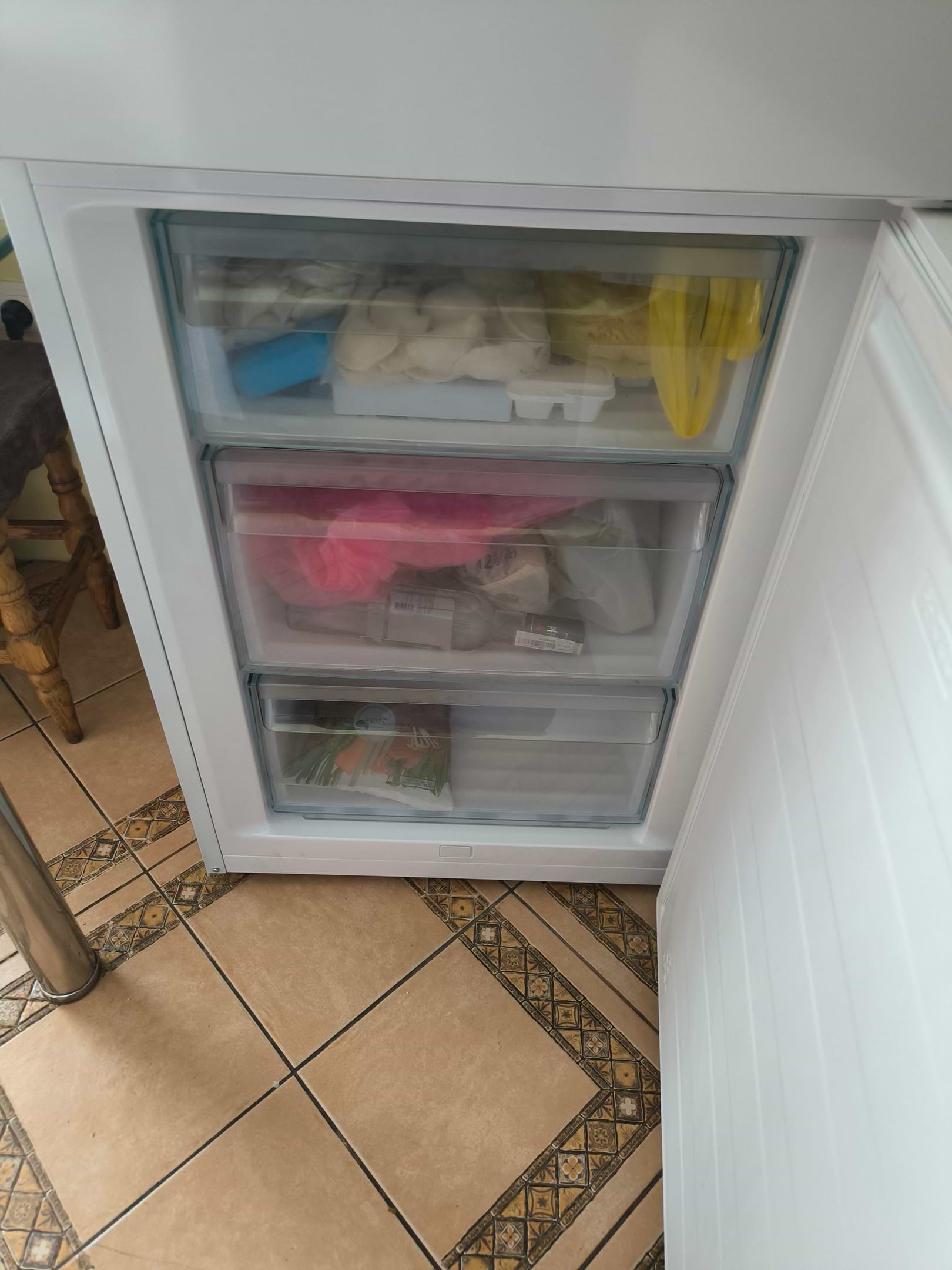 холодильник високий, всередині 4 полички для їжі, одну витягли, бо великі каструлі не вміщались. морозилка не велика, самий нижній ящик - найменший. тихо працює, холод тримає добре. після розпаковки холодильника (купували з доставкою) помітили вмятину на боковій частині знизу. хочу зауважити ящикдля овочів великий, не має розділення на секції, що зручно для великих овочів. лоток для яєць на 6 штук, це вже питання до виробника, чому саме на 6, а не на 4?)))