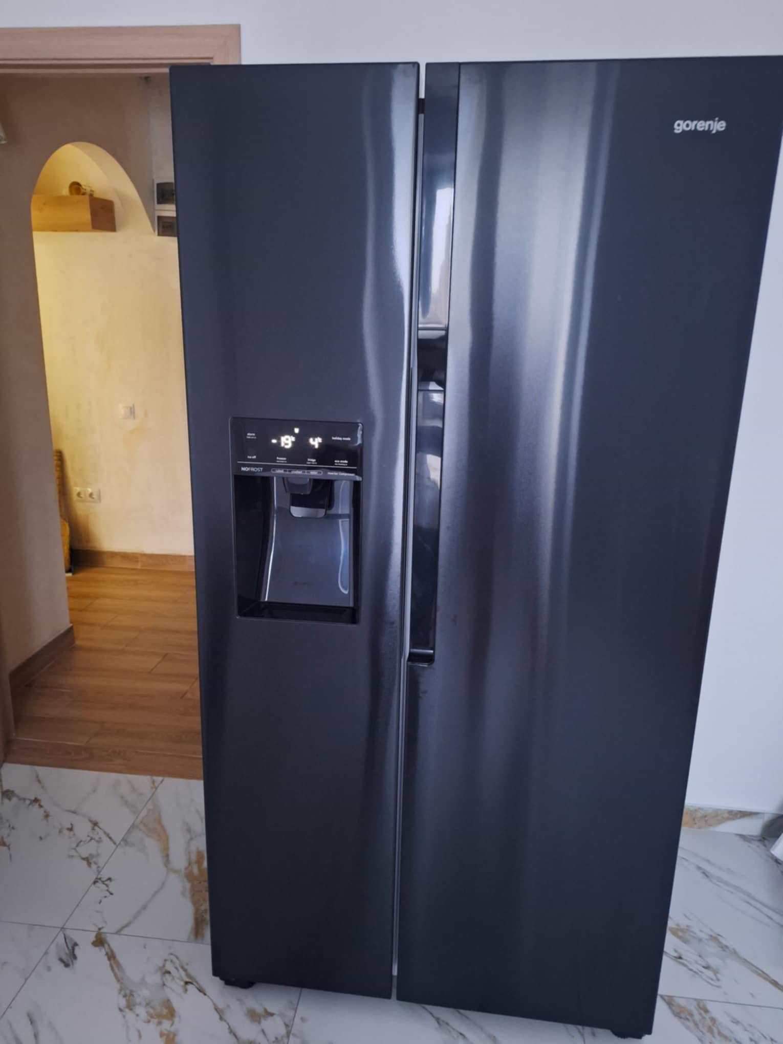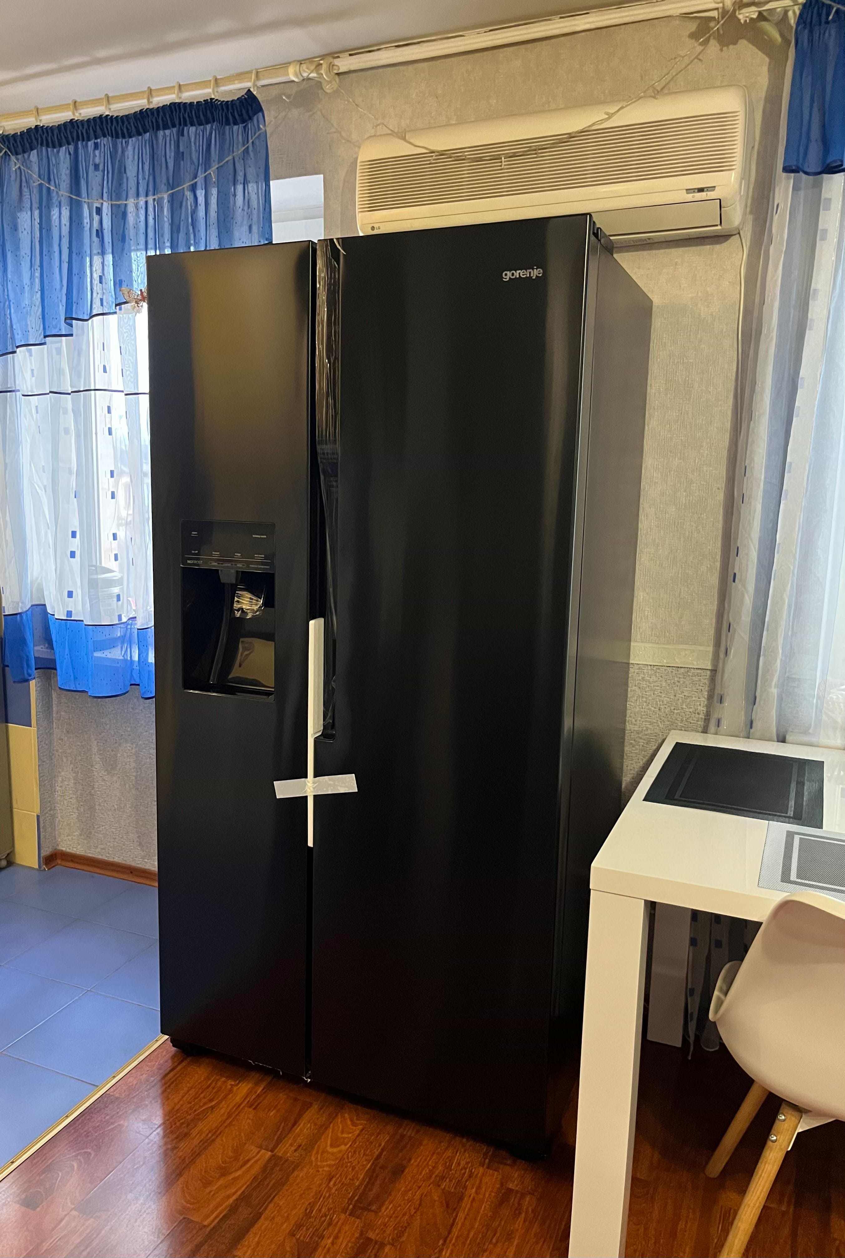 Модель Gorenje NRS9EVB относится к большим по объему. Ее габариты составляют 90,8х179,3х67,9 см. Морозильная и холодильная камеры располагаются рядом и оборудованы раздельными дверьми. Конструкция по типу Side-by-Side популярна благодаря таким преимуществам: