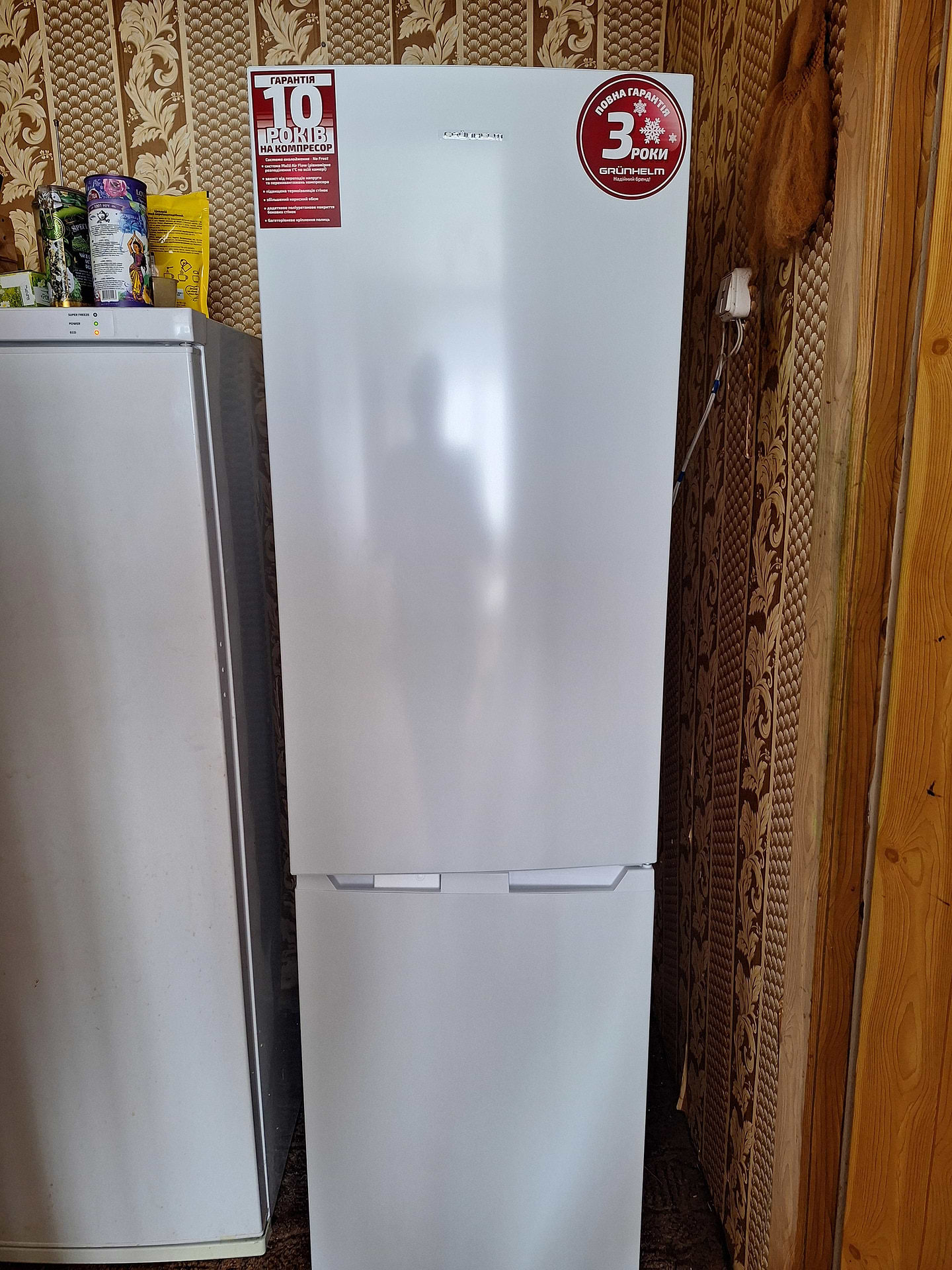 Вузький холодильник NoFrost-вибрали Grunhelm BRH-N181М55-W- ширина 54,5см., Висота 181см. Це знахідка-стильний, красивий, економ, безшумний, вмісткий, з гарних матеріалів. Працює тихо, морозить добре-не переморожує продукти. Морозилка знизу- 3 ящики; 4 скляні полички-можно переставляти, є ящик для овочив; 3 полички на дверцятах-не перенавішуються, але це добре-бо не поб'ються. Є лоток для яєць і для льоду. Довго тримає холод-добу(24 год. був відкючений і всі продукти збереглися-це важливо. Дякую працівникам Comfi за швидку доставку. Постояв добу-виставили ніжки-включили-все класно-нічого більше налаштувати не прийшлося. Електроенергія десь 3кВт за тиждень~12кВт/міс. Перенавішування дверей-Є-треба виправили в характеристиках. Дзвонила в сервісний Центр GRUNHELM є в Одесі- відповіли, що в даній моделі є ГАРАНТІЯ на компресор 10 р., а на весь холодильник 3 р.-це супер! Придбали за 13999 грн. з безкоштовною доставкою. Якість відмінна, набагато вища за ціну. Дякую за чудовий холодильник