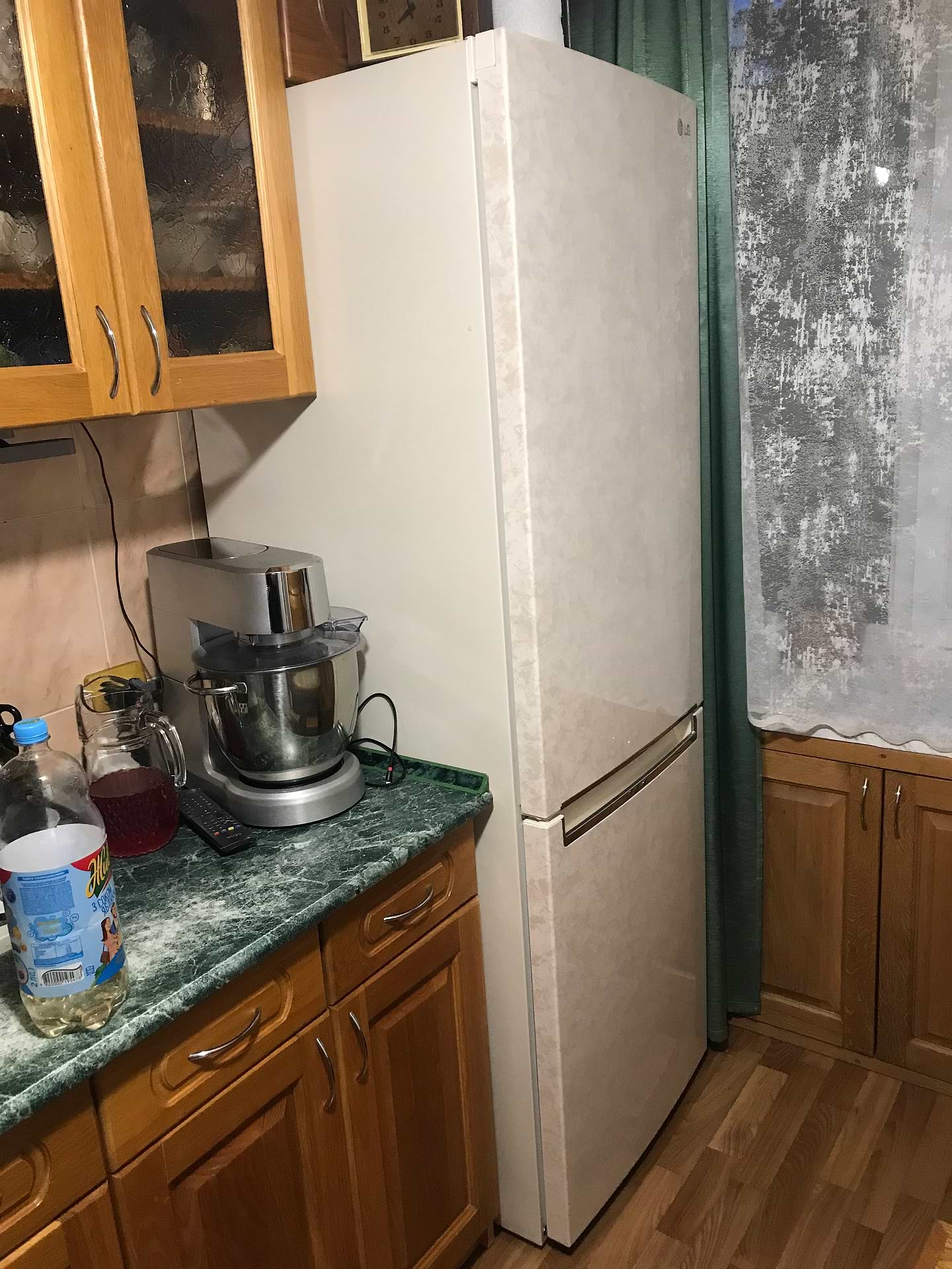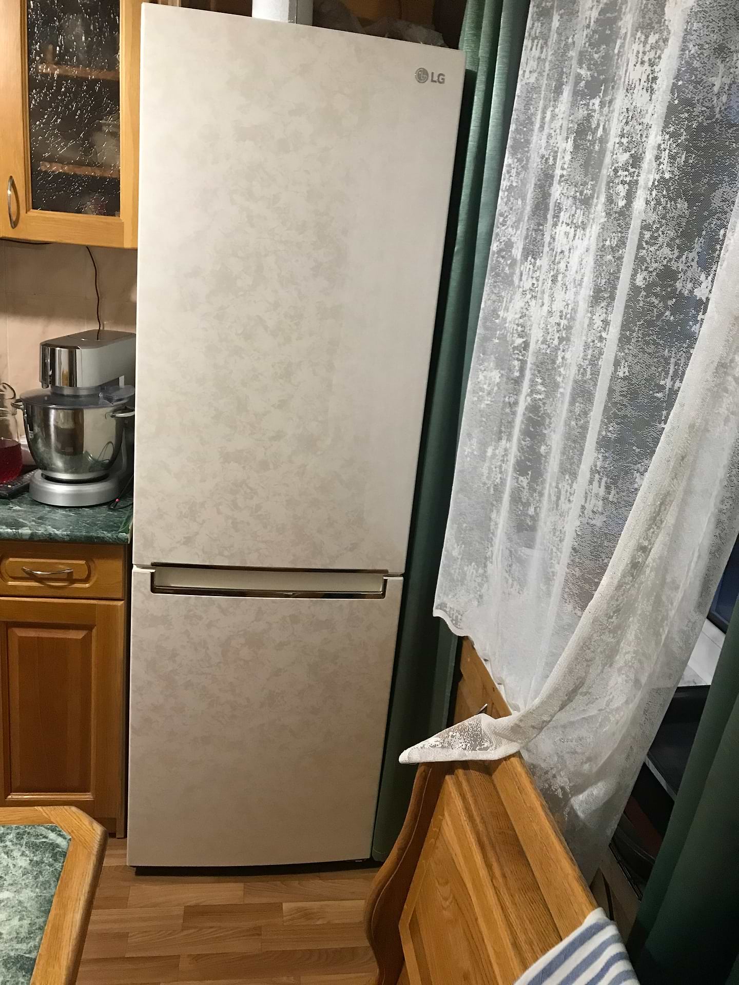 Загалом, холодильником задоволений, він тихий, місткий, як на свій розмір. Дещо розчарований полицями в дверях - вони хоч і міскі, але мало практичні, в нижній полиці зберігати пляшки незручно, так як полиця широка, і пляшки сильно хитаються, при відчинянні/зачинянні дверцят, середня полиця, теж не практична, так як там скляну тару незручно зберігати, а для соусів в пакетах місця там забагато. Верхня полиця теж має невідповідний розмір, для зберігання яєць, вона мала б бути або меншою, так як лоток є меншим, ніж полиця, або більшою, і відповідно, лоток більший. До полиць в самому холодильнику, та в морозильнику, зауважень немає, все очікувано, і досить зручно. Напевне, що хотілось би, то докупити полицю для пляшок, та складну полицю, щоб можна було поставити щось високе, таке як великий графін, 3л банку, тощо. Зверніть увагу на колір: якщо берете бежевого відтінку, то дверцята мають колір як бежевий мармур, стінки ззовні просто бежеві, а всередині холодильник білий