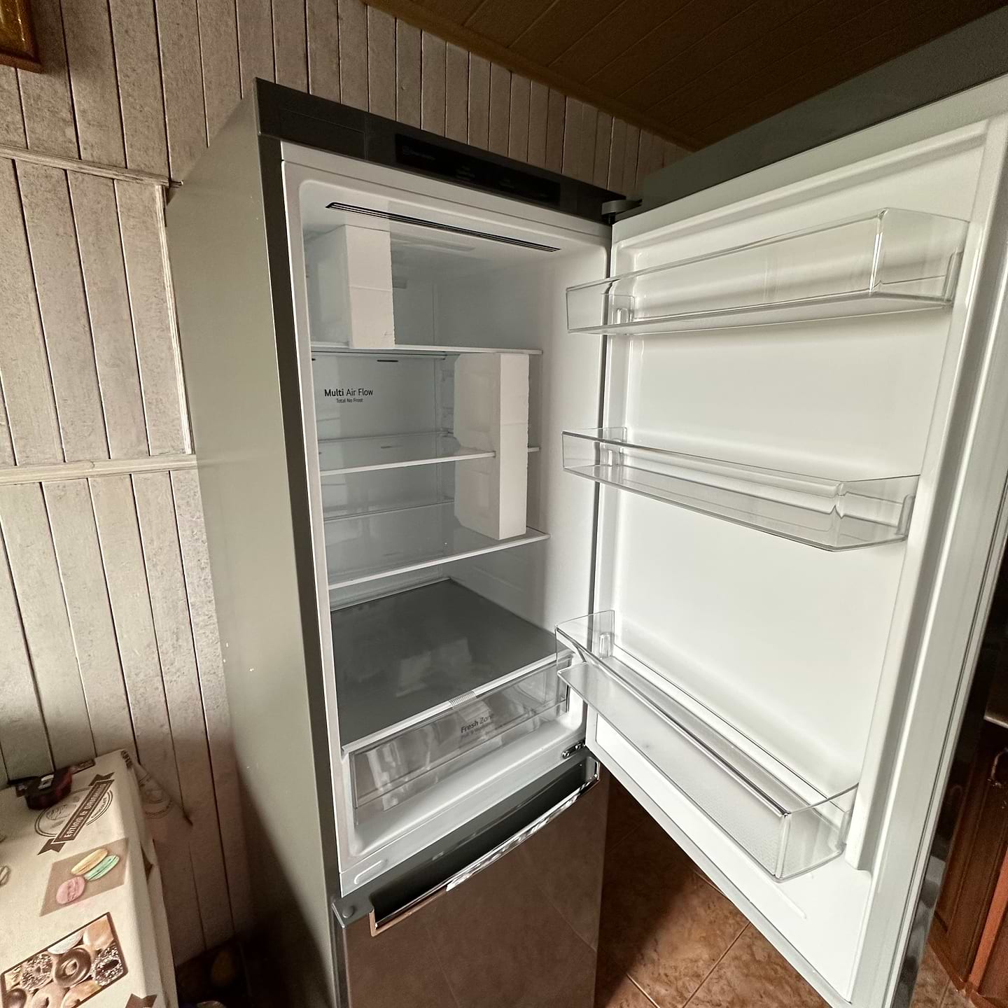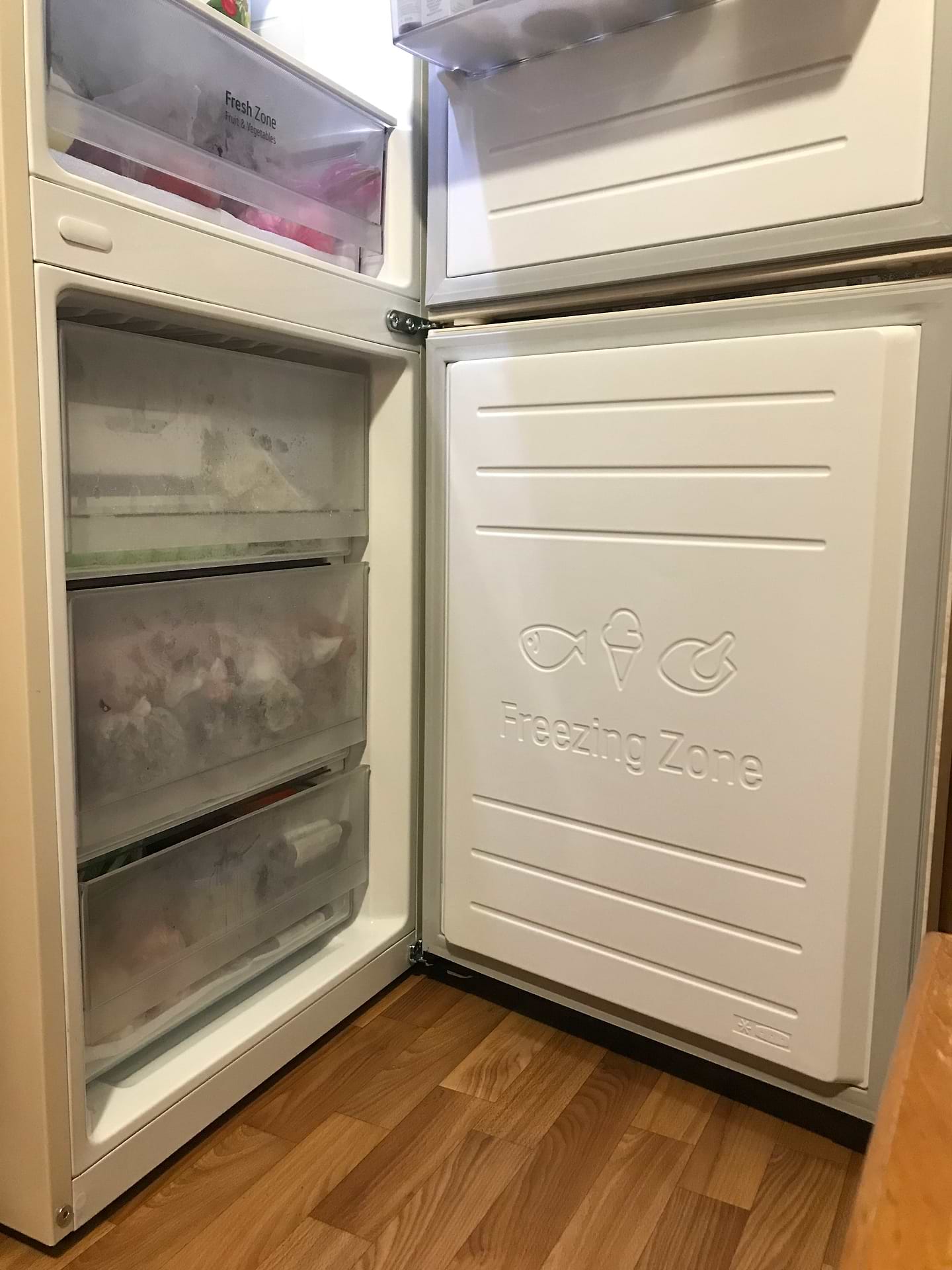 В комплекті відсутній лоток для яєць і лоток для льоду. Скляні полиці дуже тонкі, так само і ящики в морозильній камері не викликають довіру