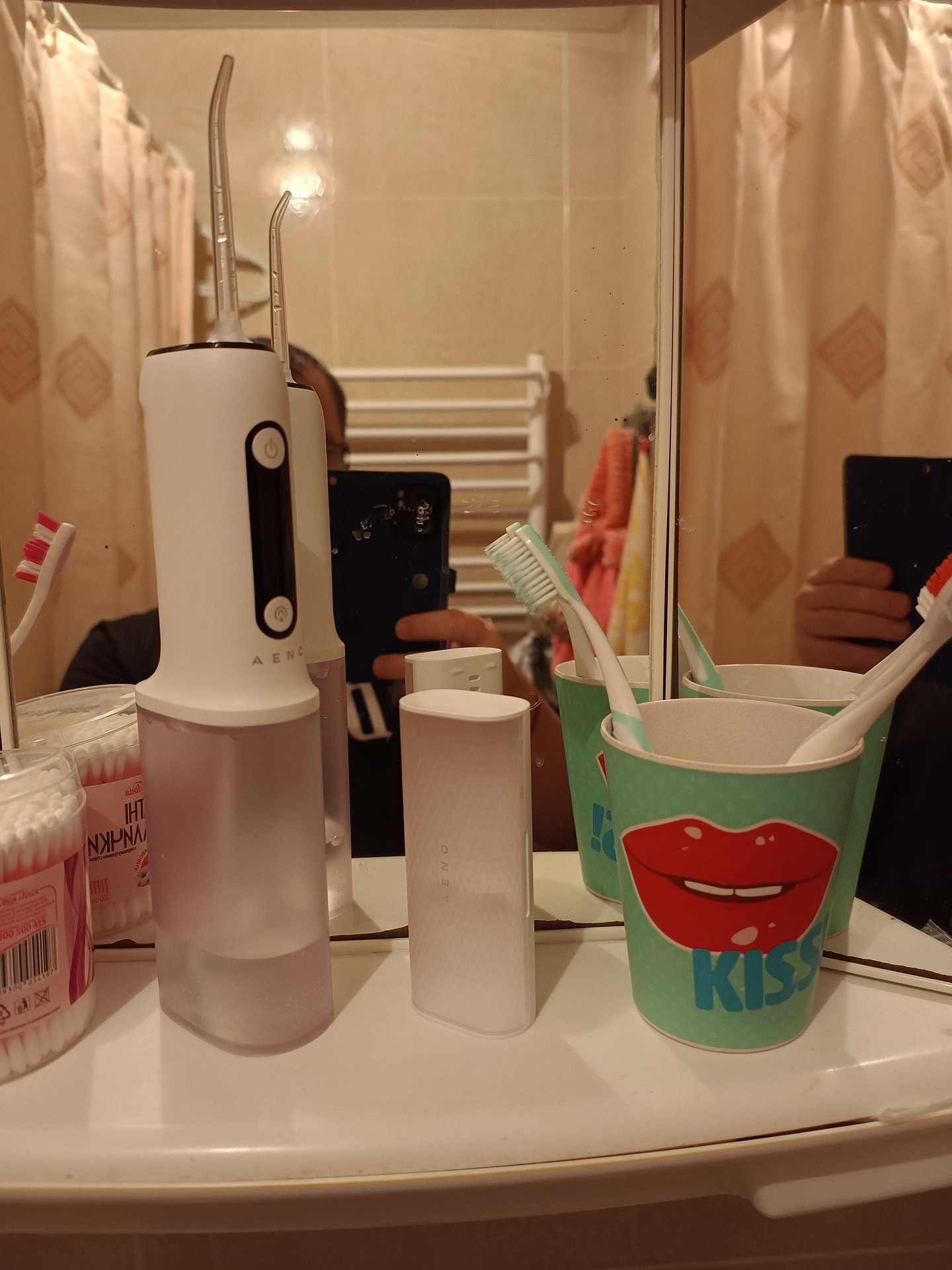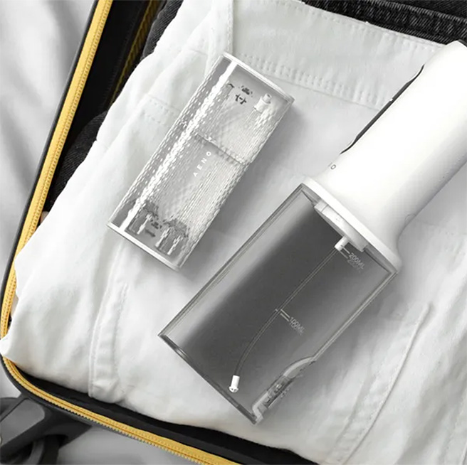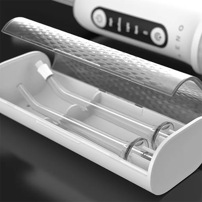 Элегантный дорожный футляр, рассчитанный на 2 насадки, обеспечивает удобство использования ирригатора AENO в любых поездках