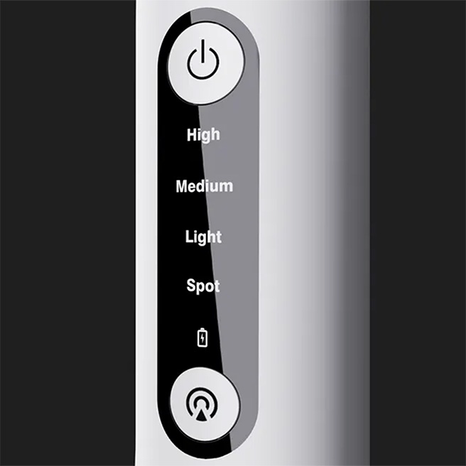 Три режима - легкий, средний и высокий, обеспечивают спектр интенсивности и давления струи воды для различных состояний зубов, десен и их чувствительности. Подходит для тех, кто предпочитает мягкую чистку зубов, а так же для пользователей, кто нуждается в более интенсивной чистке, обеспечивая индивидуальный и комфортный опыт. Точечный режим - для целенаправленной и мощной чистки определенного участка. Каждый режим чистки ирригатором имеет 3 дополнительных уровня интенсивности. Эта функция позволяет точно настроить работу ирригатора, обеспечивая идеальный баланс между тщательной очисткой и бережным уходом