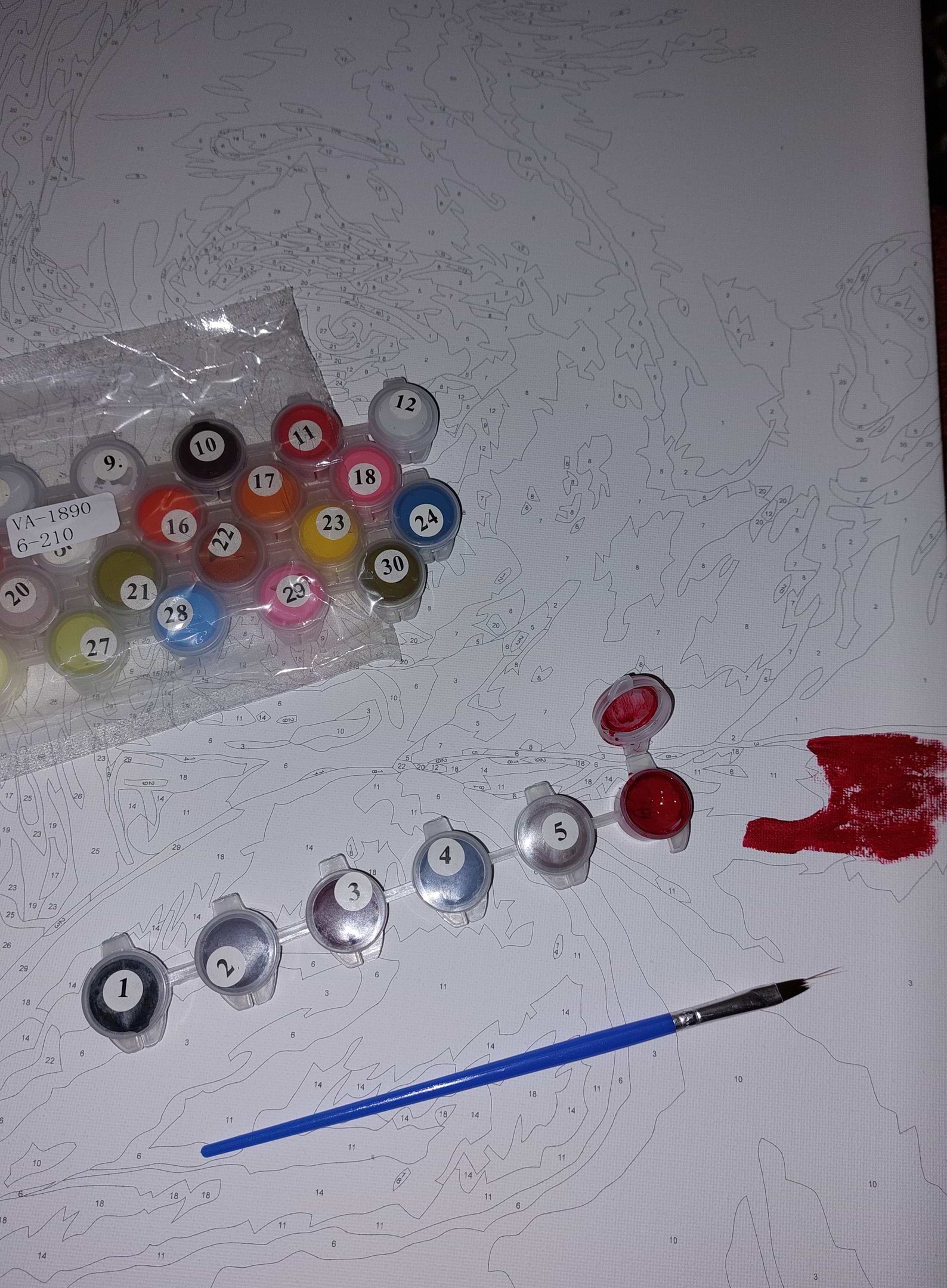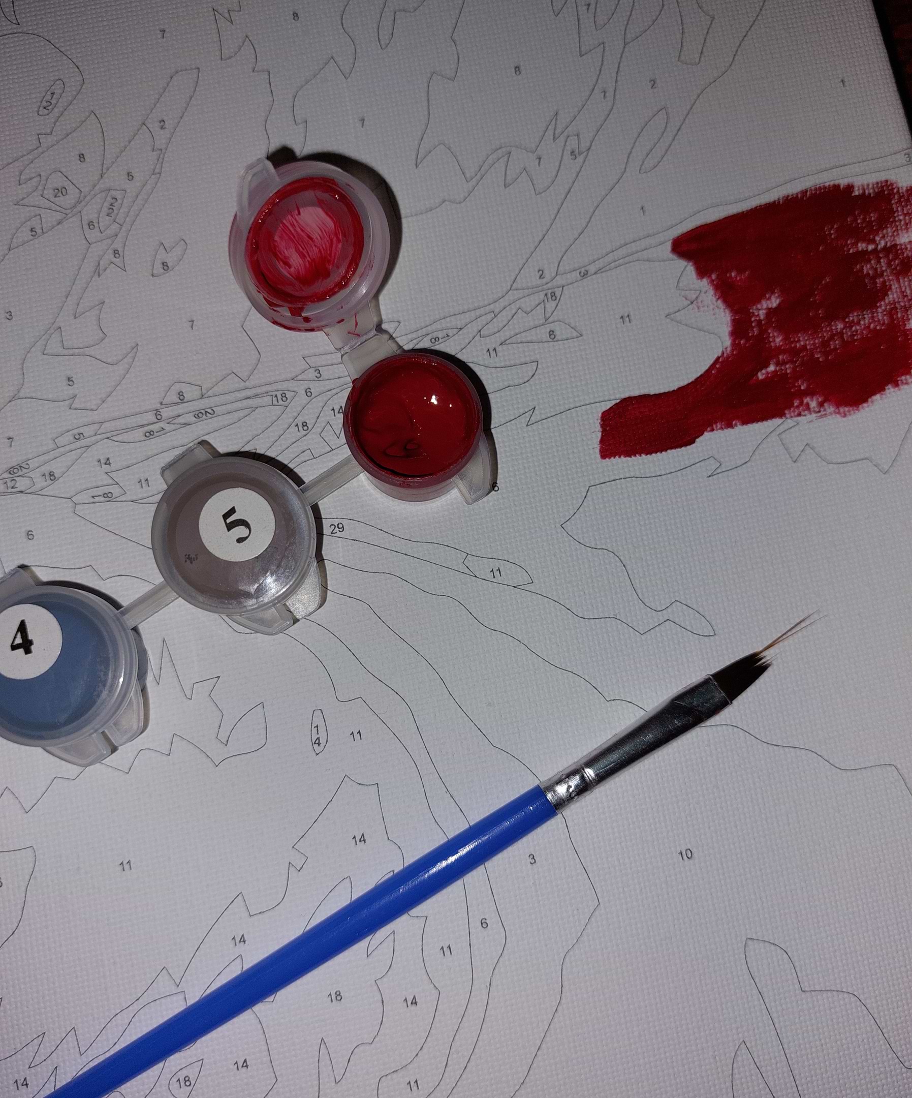 Чудова картина, в комплекті є все необхідне (полотно с підрамником і кріпленнями, три пензлі, 30 різних фарб, графічна схема). Баночки з фарбами повні, багато залишилося.