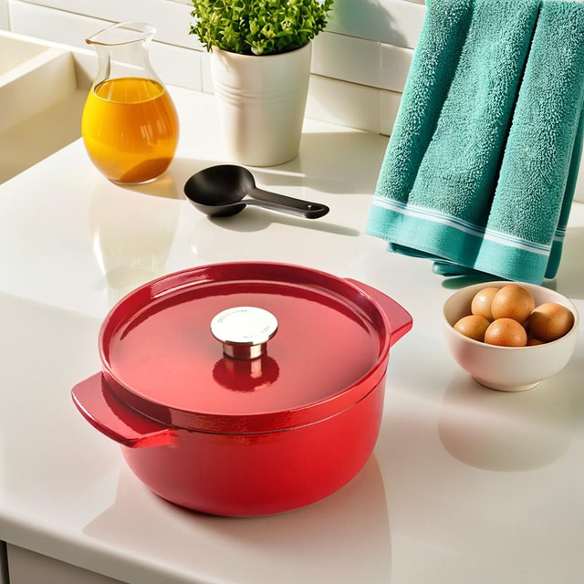 Европейский бренд KitchenAid славится своим высоким качеством и инновационными технологиями. Это касается как сложных устройств вроде миксеров и кухонных комбайнов, так и фирменной посуды. Данная модель, изготовленная из прочного чугуна, дополнена элементами из нержавеющей стали и имеет эмалированное покрытие. Она сочетает элегантный стиль с функциональностью, сохраняя при этом доступную цену.