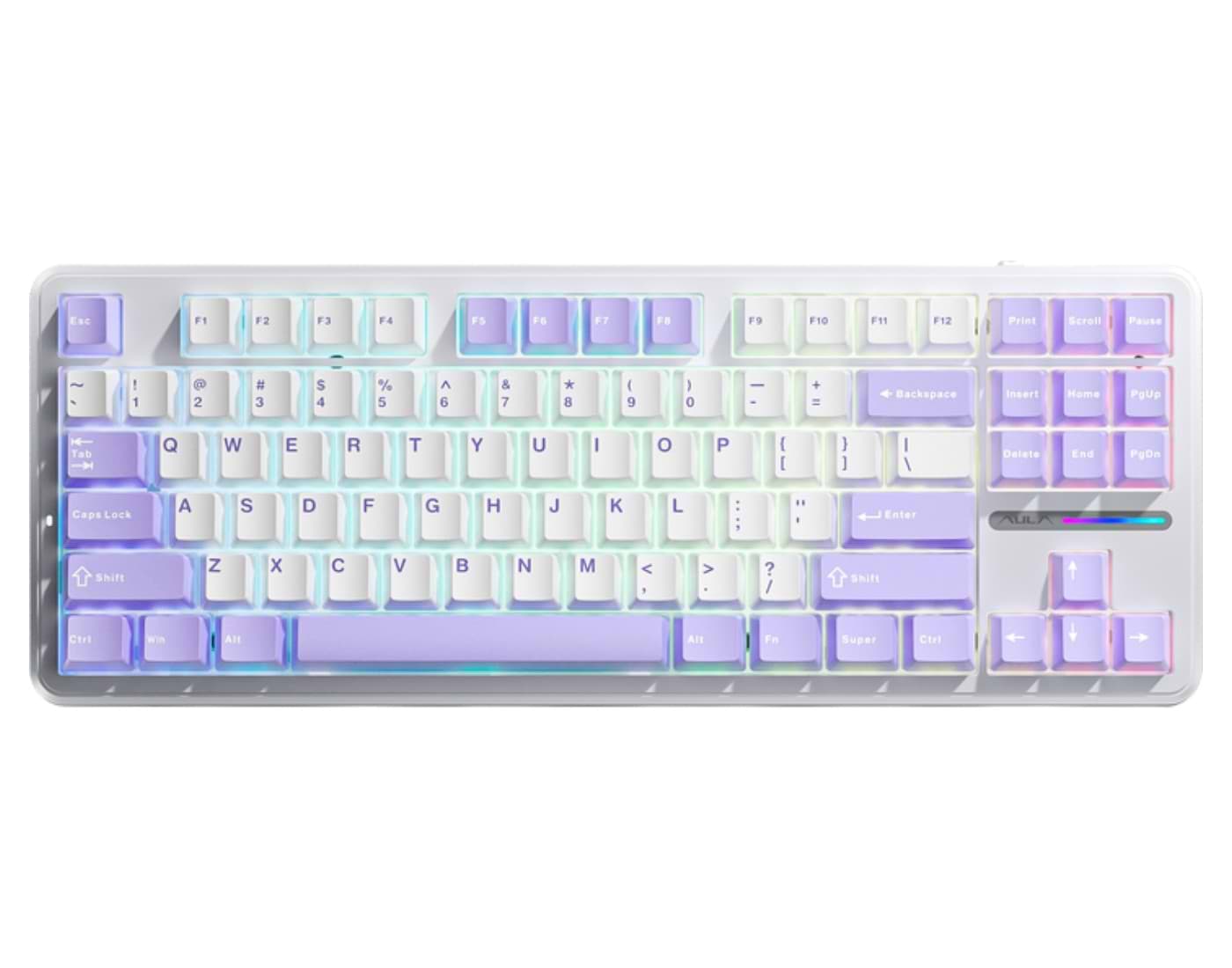 Клавиатура имеет только 1 режим цвета, на фото товара указано что она сияет всеми цветами. Драйвера аулы её не видят. Клавиатура действительно имеет много режимов подсветки. Но цвет только бирюзовый. Если вам нужна версия ф87 с полным ргб - там не будут подсвечиваться буквы. В этой же версии они сияют.