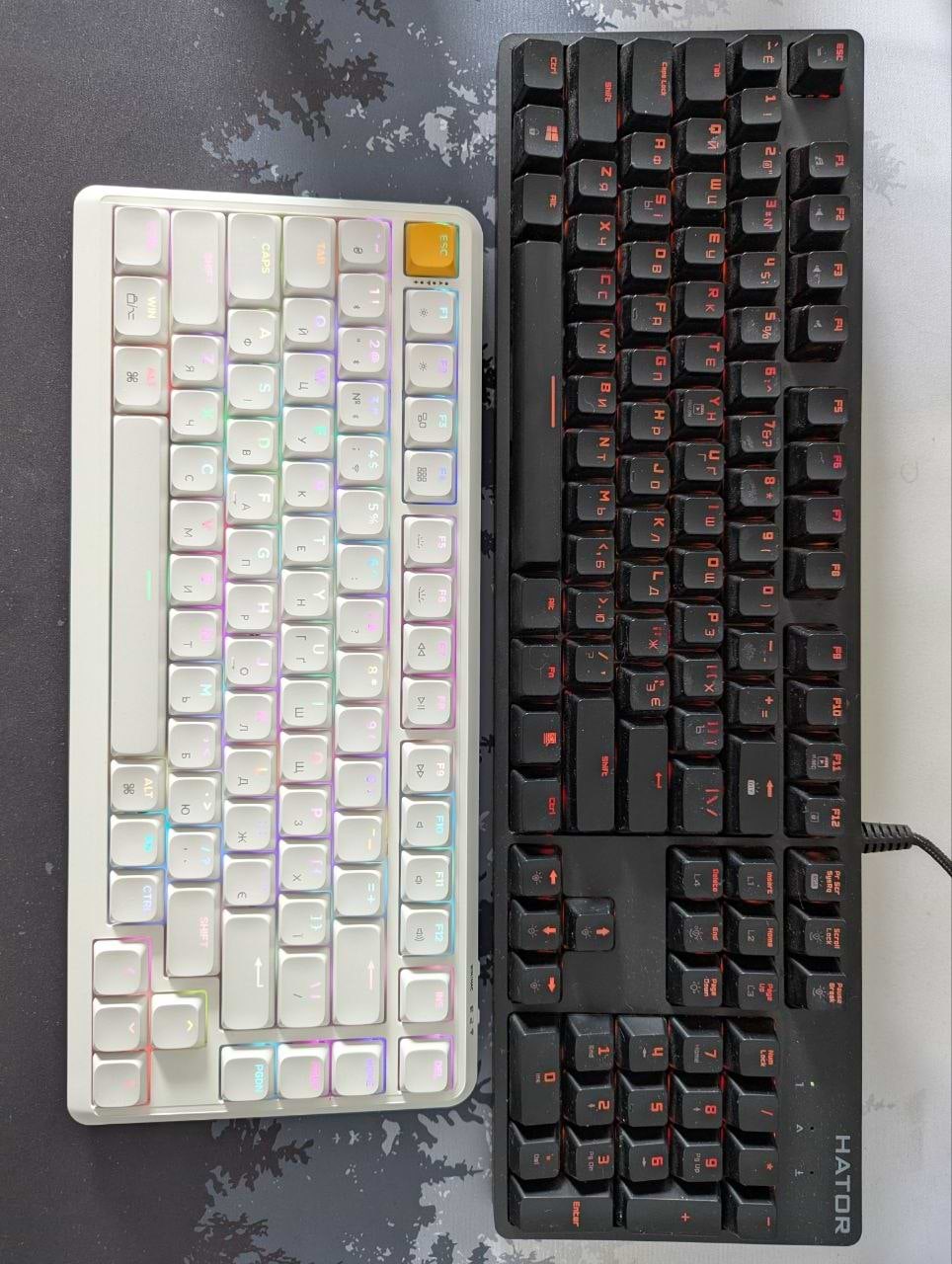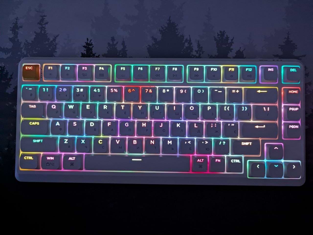 Клава на дотик ну дуууже приємна. коли дістаєш її з коробки, то прям кайфуєш, неможливо відірватись. якісно зроблена, все таке приємне в ній: і розмір і хід світчей і звук натискання - емоцій купа позитивних. АЛЕ... є і негативний досвід, мабуть, для деяких буде не критичний, а для інших суттєвим, а саме я кажу про те, що немає кнопки Прінскрін (навіть на додатковому шарі з натиснутою кнопкою FN) - прийшлось у Віндовс перепризначати за допомогою стороннього софту на комбінацію клавіш. Та це ще не саме головне з негативного, а головне те, що у темряві не видно українських букв та символів додаткового шару (на фото показав) - це вже софтом не виправити, на жаль. А ще ніжки не регулюються, тобто неможливо змінити кут нахилу клави, хоча це при замовлені ми знали і бачили на промо.