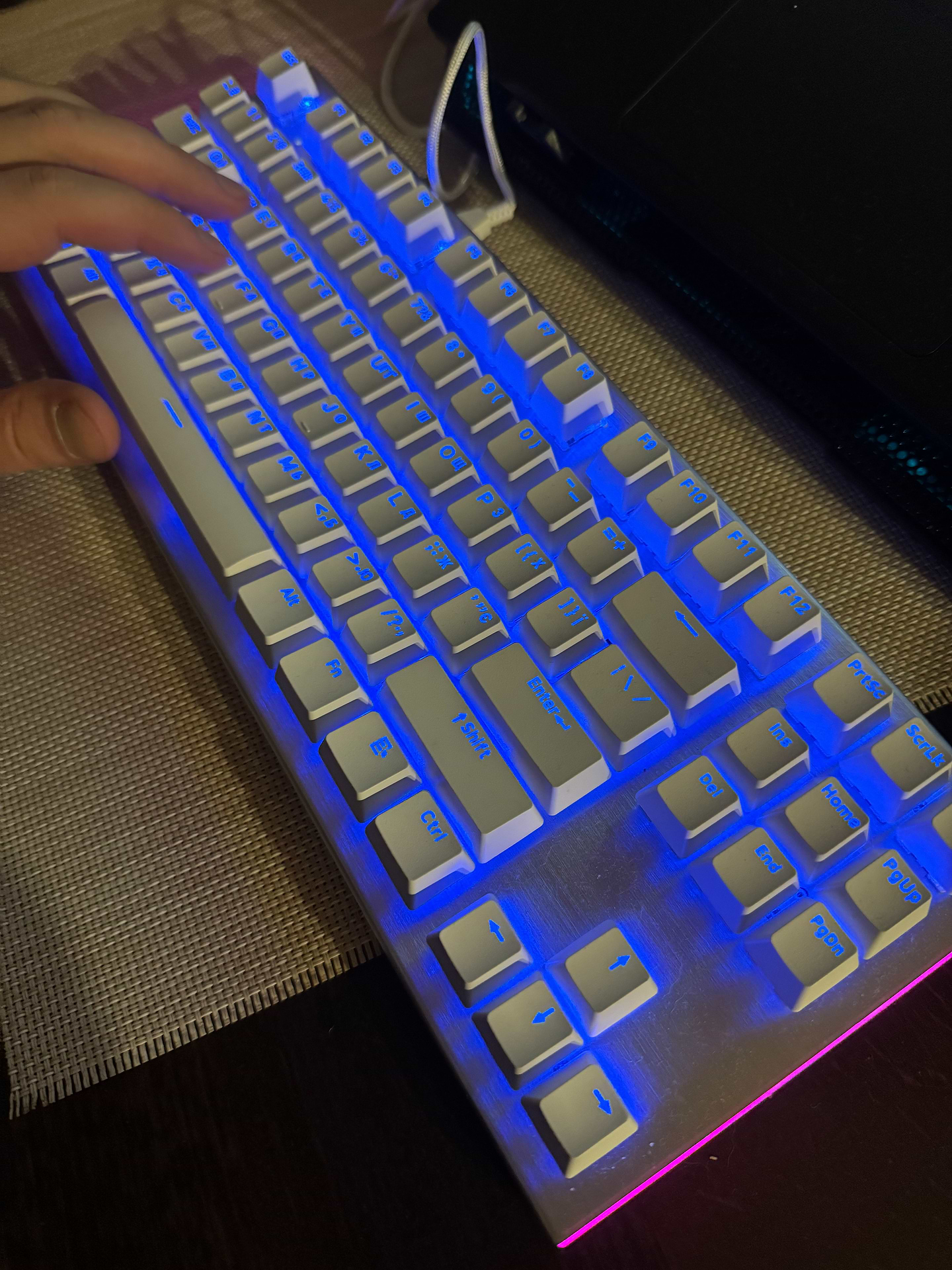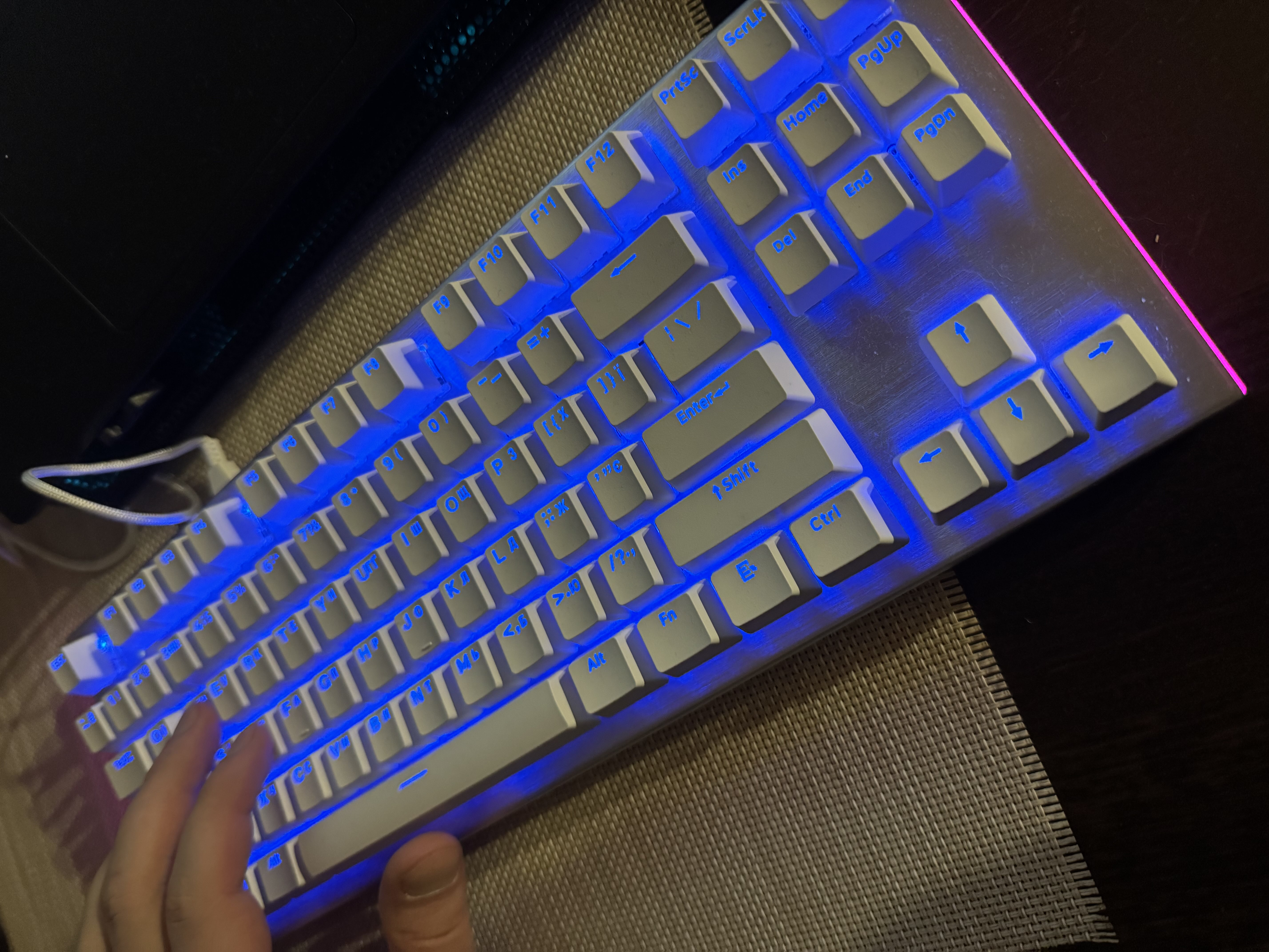 Неймовірно стильна клавіатура — білий колір з RGB виглядає просто вау! Не тільки красива, а й дуже зручна. Збірка відчувається якісною, нічого не скрипить, корпус жорсткий і не скрипучий. Навіть кейкапи приємні на дотик. Клавіатура досить тиха для механіки, можна довго працювати.