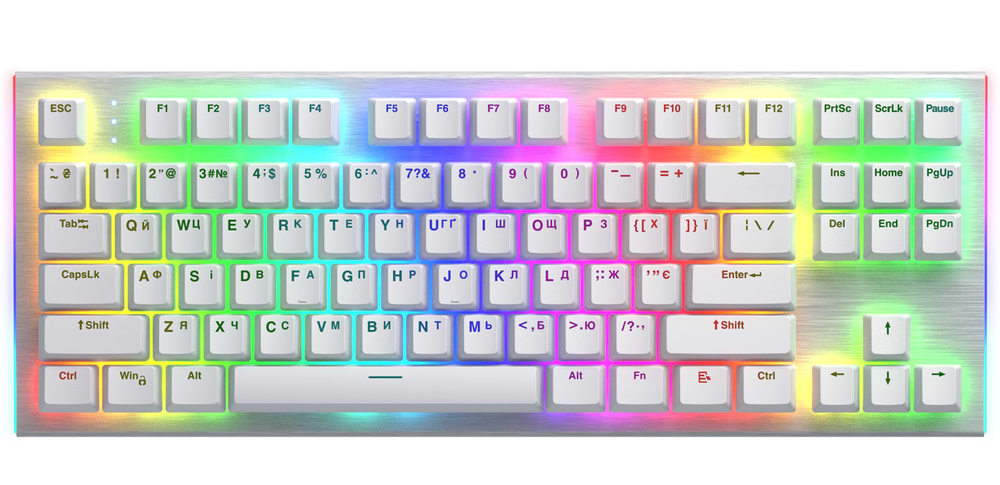 сподобався металевий корпус, клавіатура міцно стоїть на столі не двигаючись із-за випадкових дій, добрий софт для керуванням клавіатури, доступна ціна)