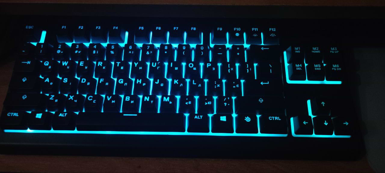 Гарна клавіатура за свої гроші, але не без мінусів. Нема своєї пам'яті для налаштувань підсвітки, тобто при перезапуску ноуту/пк/usb - налаштування підтягуються з программи стілсірієса і при цьому яскравість не зберігається якщо змінюю через клавішу на клавіатурі. Також через це - плавність анімації підсвітки (якщо вона не статична) залежить від навантаження на пристрій, якщо ноутбук підвисає то і підсвітка теж зупиняється.