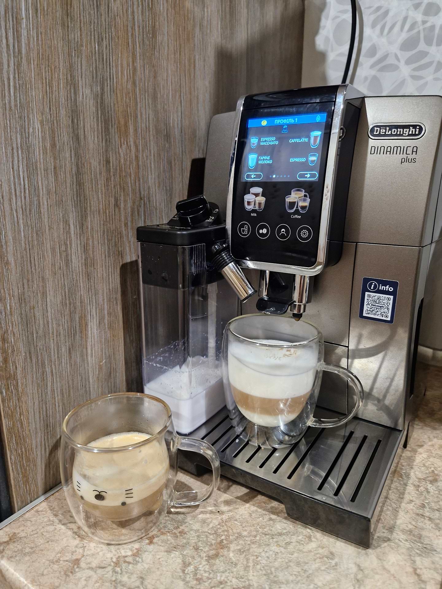 Придбали тиждень тому, дуже легка в керування все зрозуміло. Є різні мови та є можливість керування різними профілями.Все що потрібно виводить на дисплей що дуже зручно наприклад засипати кави чи долити води.Зручно заливати воду та засипати каву в резервуар. Є дві ємності для молока що зручно.Для дітей дуже сподобалась функція гарячого молока з пінкою яку можливо виставити по об'єму.