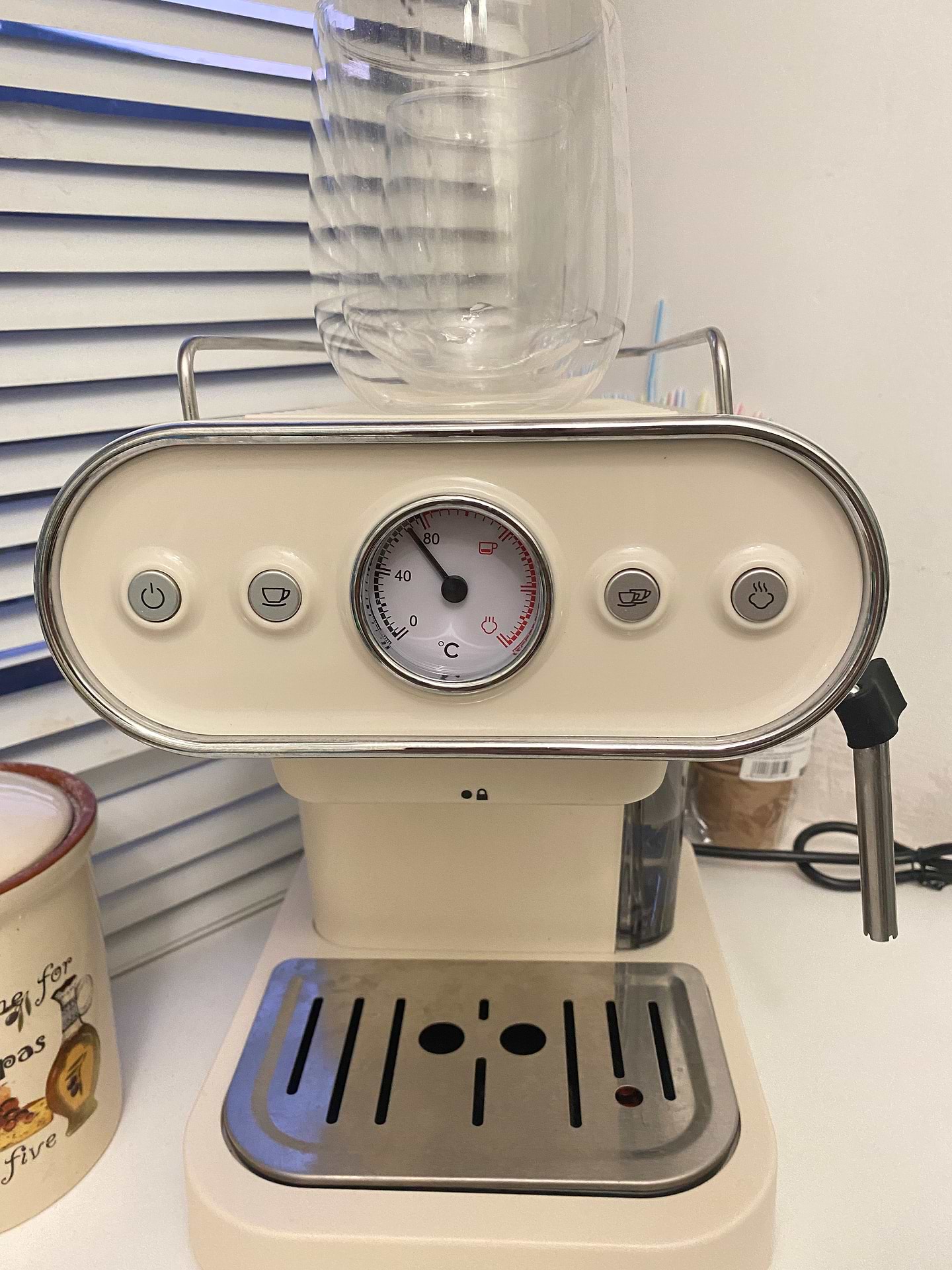 Красиво та стильно виглядає, невелика за розміром, швидко нагрівається, гарно готує еспресо, стімер взбиває еластичну піну