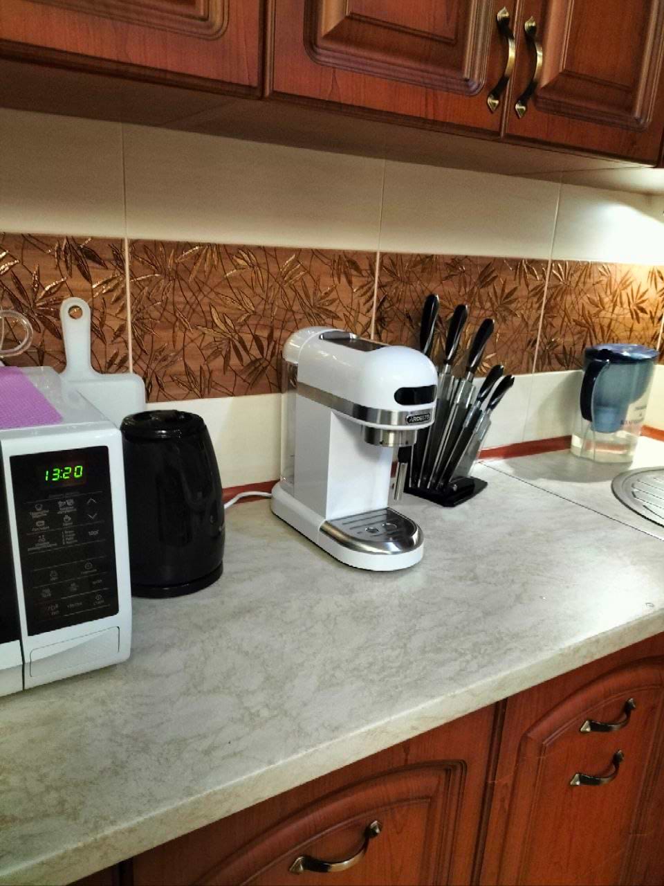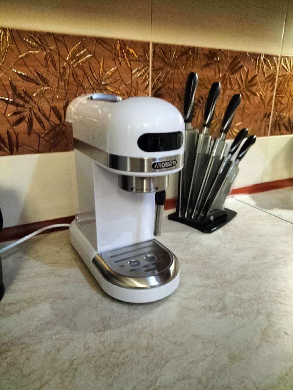 Стильно смотрится, компактная, достаточно большой объем контейнера для воды. Сенсорные кнопки. Покупали для родителей. Довольны. Кофе вкусный!