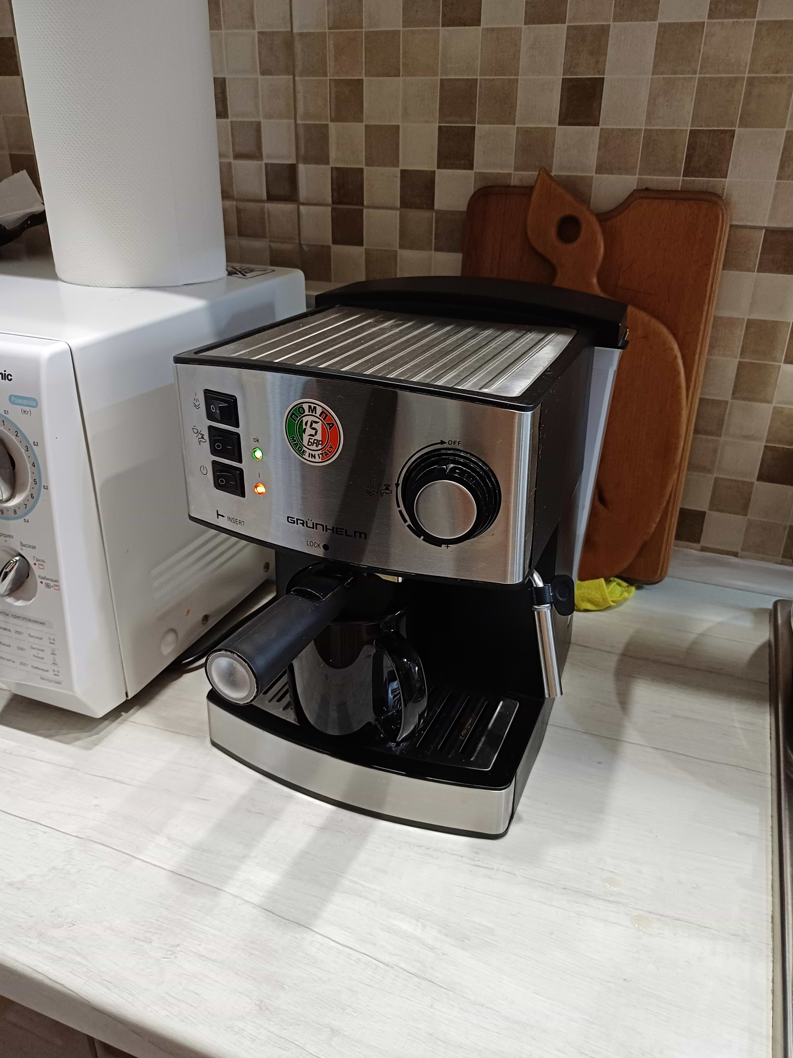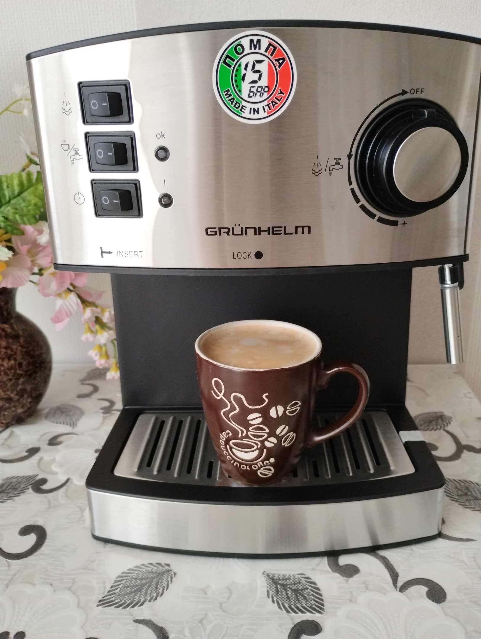 Капучинатор працює добре — молочна пінка виходить ніжна. Дуже подобається, що кавоварка компактна, не займає багато місця на кухні.