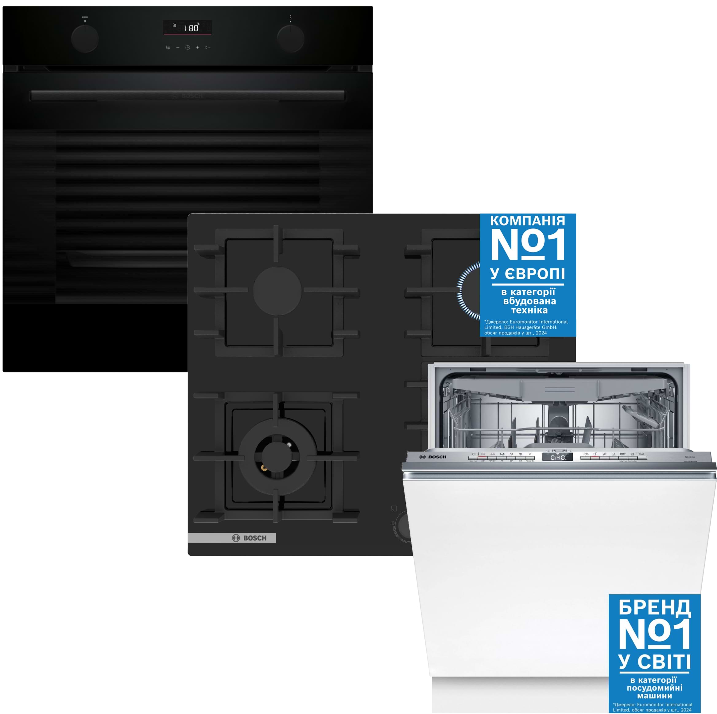 Все о Комплект техники Bosch Духовой шкаф + Варочная панель + Посудомоечная машина встраиваемая Bosch HUA736EA0T + PNK6B6P40R + SMV4HVX00K