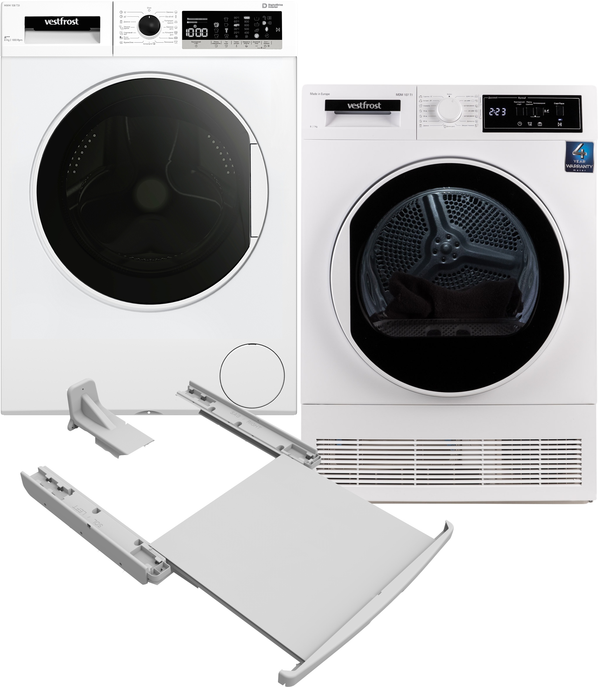 Комплект техники Vestfrost Стиральная машина с фронтальной загрузкой + Сушильная машина + Комплект креплений для установки в колонну Vestfrost MWM 108 T3I + MDM 107 T1 + XDV