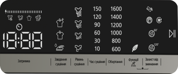 дозволяє відкладати момент запуску сушіння на зручний для користувача час (від 1 до 23 годин) – за допомогою сенсорної панелі можна швидко вказати потрібні параметри.