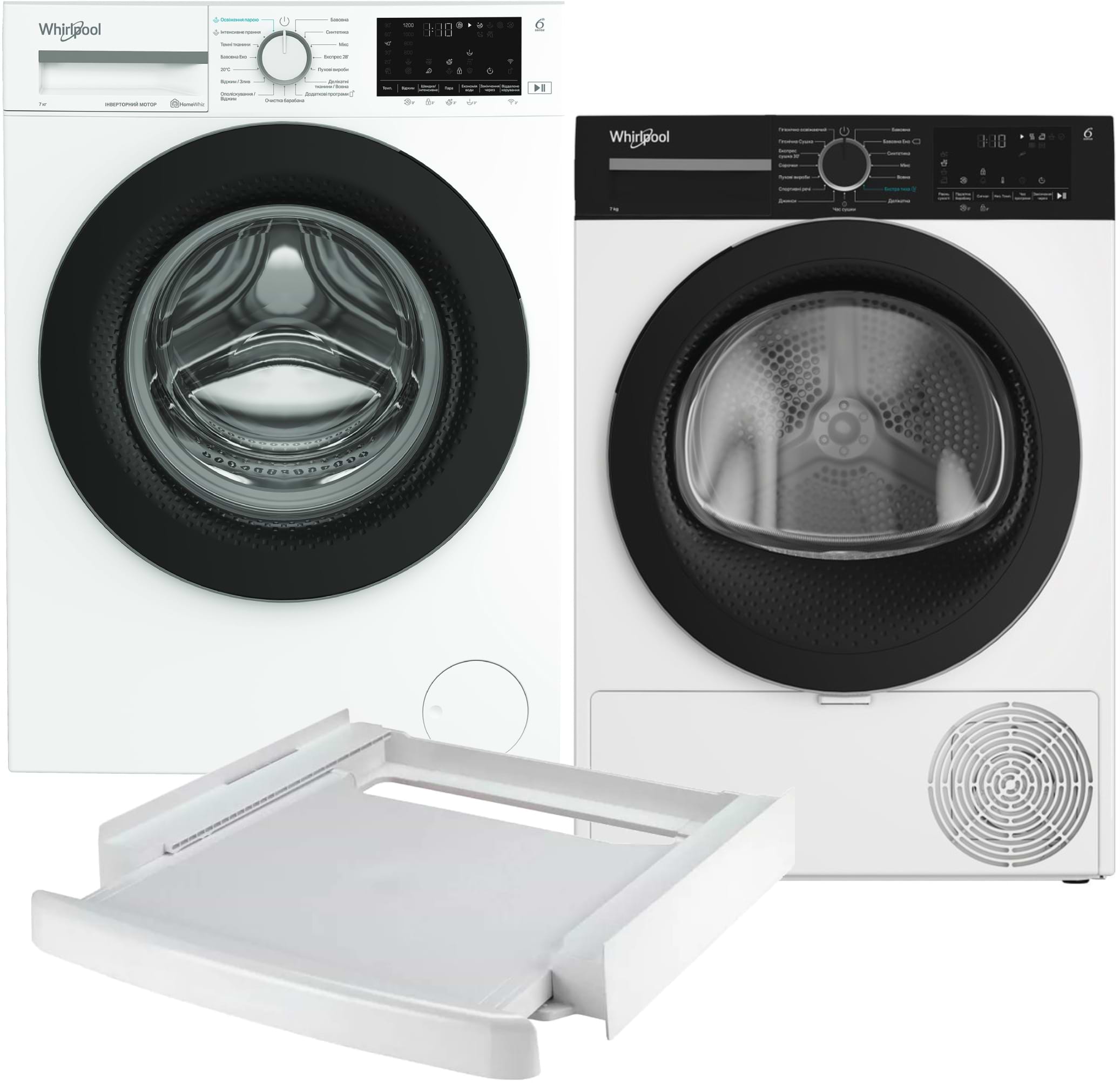 Комплект техники Whirlpool Стиральная машина с фронтальной загрузкой + Сушильная машина + Комплект креплений для установки в колонну Whirlpool WAM 712WB UA + WPS 7 WBS UA + SKS101 White
