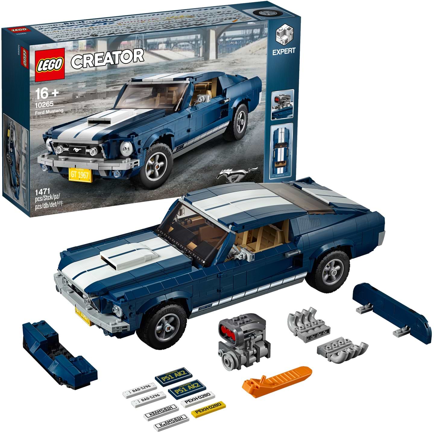 Собери собственный автомобиль Ford Mustang с темно-синим корпусом, белыми гоночными полосами, агрессивным воздухозаборником, классными дисками с 5 спицами и шинами с высоким коэффициентом сцепления! Разработанная совместно с компанией Ford, эта отличная модель воспроизводит красоту легендарной мощной машины, характерной для Америки 60-х годов. В набор входят различные приложения для тюнинга, включая турбокомпрессор, оригинальный задний спойлер, мощные выхлопные трубы, спойлер бампера и баллон с оксидом азота. Можно даже сменить высоту задней оси, чтобы выглядеть еще круче! Открой багажник, чтобы сложить приложения, подними капот, чтобы рассмотреть большой детализированный V-образный 8-цилиндровый двигатель 390-го класса с аккумулятором, шлангами и воздушным фильтром. Затем открой дверцу или сними панель-крышу, чтобы открыть доступ в детализированный салон с прекрасными сиденьями, радио, рычагом передач на консоли и рабочим рулевым управлением! Решетка, логотип GT и набор номерных знаков добавят этой невероятной модели серии LEGO Creator Expert финальных штрихов!