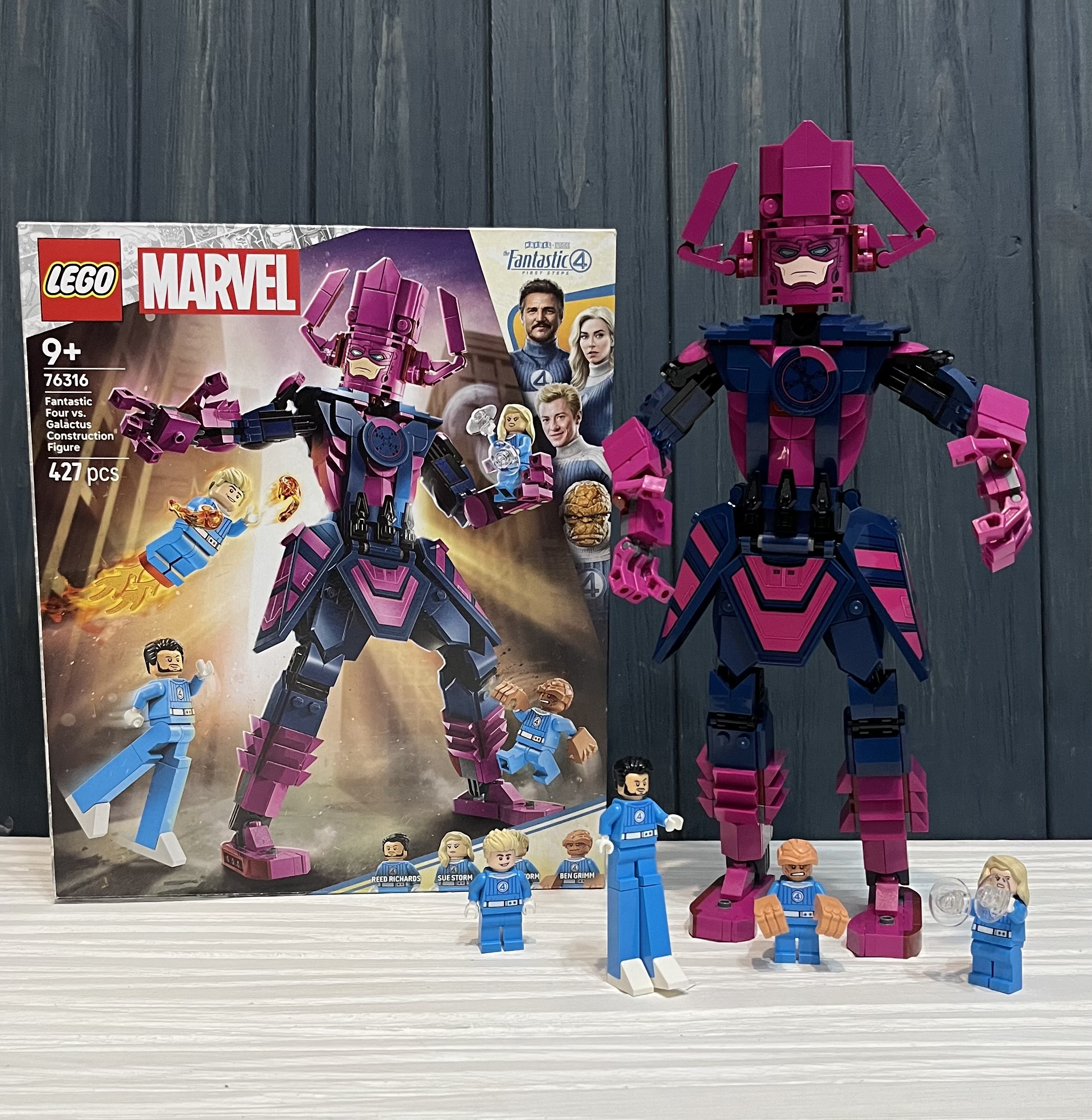 Дуже довго чекали коли цей набір зʼявиться в Україні і нарешті дочекались! Гарні кольори, особливо блакитний - колір костюмів четвірки. Галактус видався занадто крихким. Погано продумано зʼєднання деталей. Поставити на полицю - не більше.