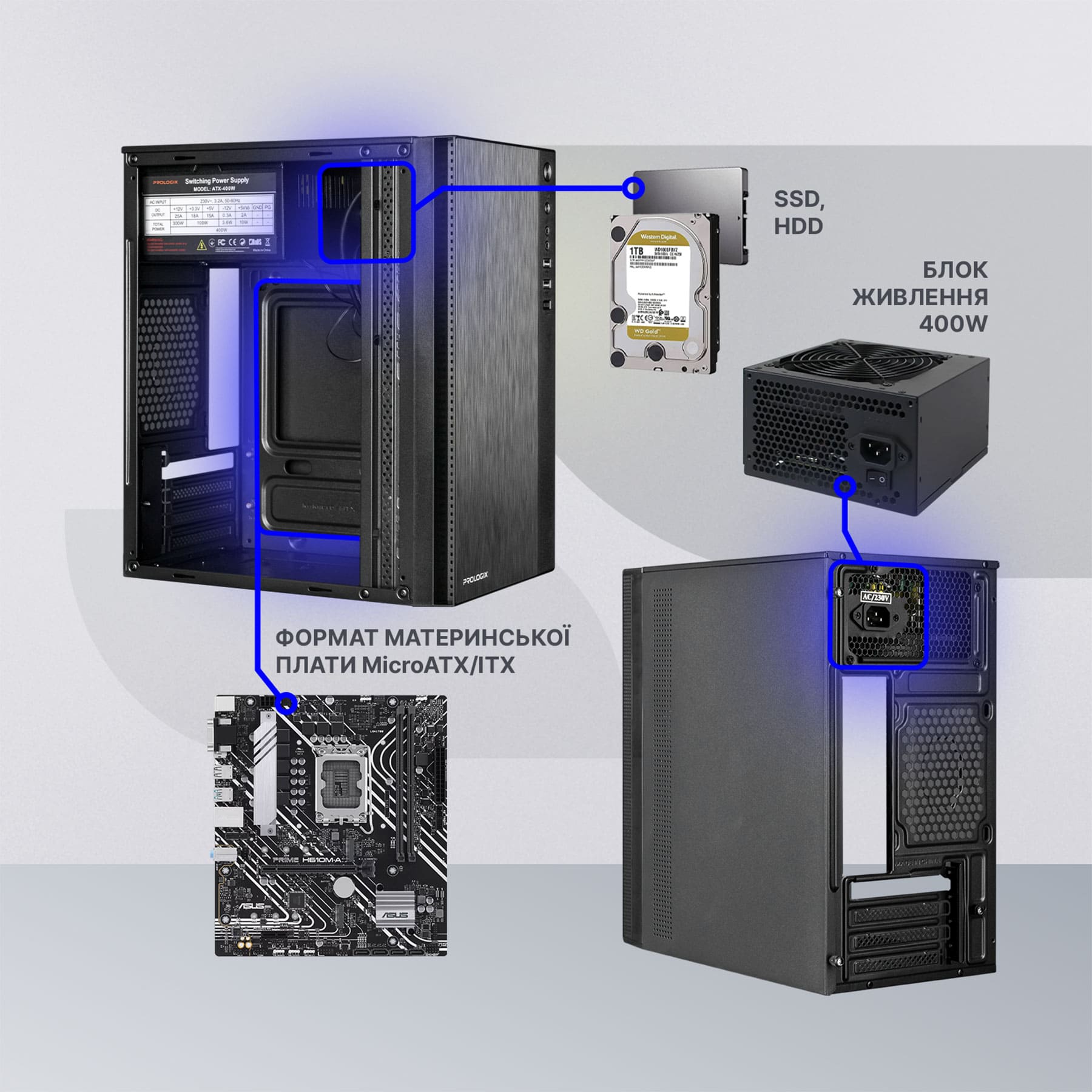 Эргономичное внутреннее пространство корпуса Prologix E 124, предусматривает 4 отсека под 2,5” SSD накопители и 2 отсека 3,5” для жестких дисков (всего 4 слота). Есть возможность установки башенного кулера для ЦП с высотой до 150мм, а также видеокарты длинной до 280мм. В комплекте идет все необходимое для монтажа комплектующих.