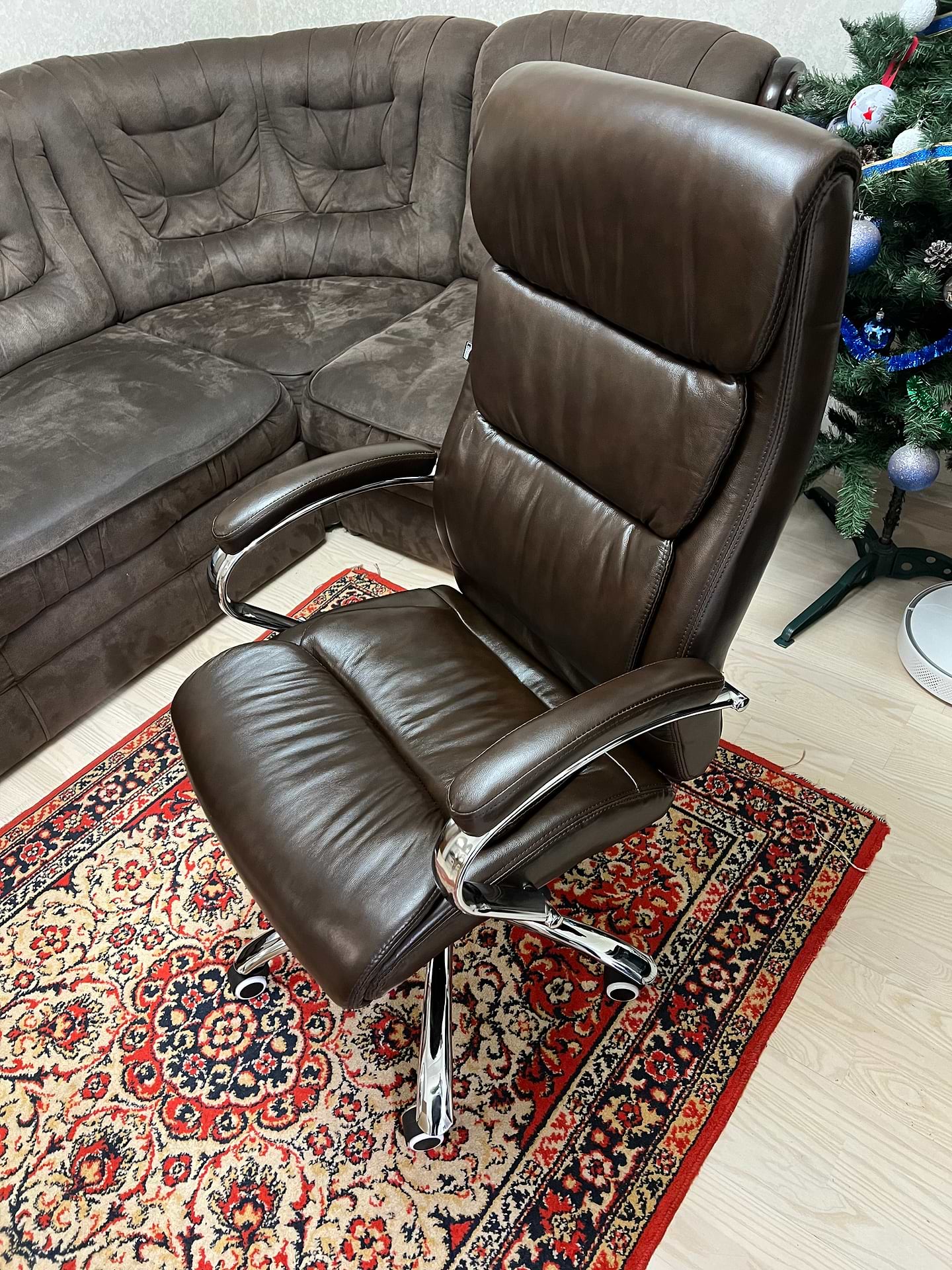 Крісло чудове, якісне, зручне для сидіння. В дійсності має кращий вигляд ніж на фото. Спинка і сидіння обшите натуральною шкірою. Боковинки обшиті Екошкірою.