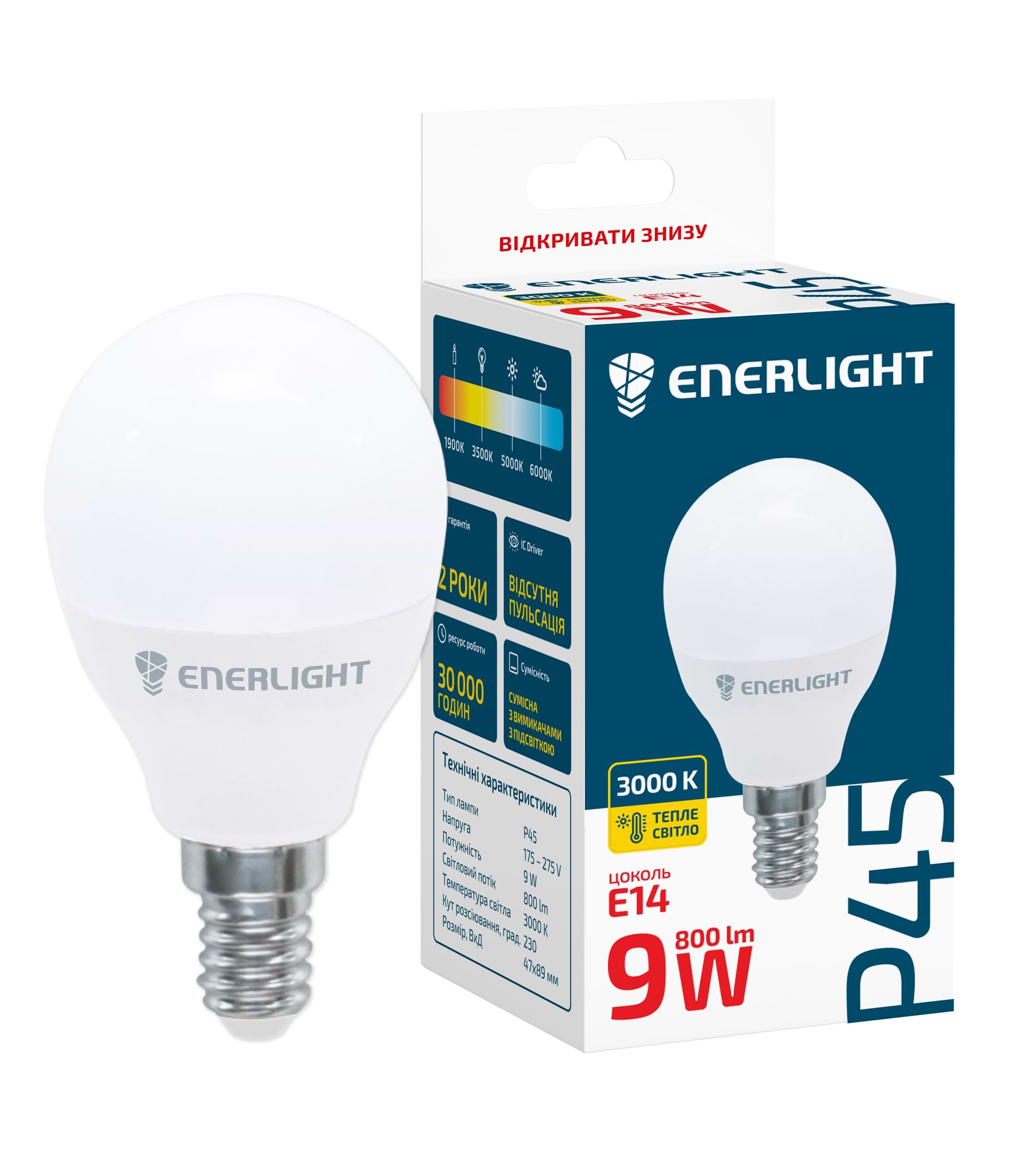 Характеристики Enerlight P45 9Вт 3000K E14