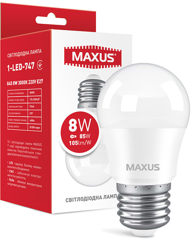 Характеристики Maxus G45 8W 3000K 220V E27 (1-LED-747)