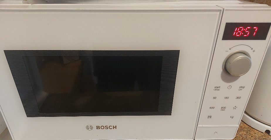 Це якісна мікрохвильова піч від Bosch. Але потенційним покупцям слід знати, що керування не є сенсорним, а годинник вимагає постійного переналаштування/вимкнення після стрибків напруги, але це проблема багатьох брендів. Загалом – задоволений.
