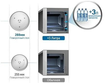 Благодаря продуманной конструкции микроволновой печи инженерам компании удалось существенно расширить ее внутренний объем, оставив внешние габариты прежними. Общий прирост составил 3 литра и позволил разместить в корпусе увеличенную в диаметре до 288мм поворотную тарелку. Сама же печь Samsung ME83KRW-1/BW, купить в Комфи которую будет всегда удобно, имеет полезный объем 23 литра и может сравниться с обычными 20-литровыми аналогами по своим внешним габаритам.