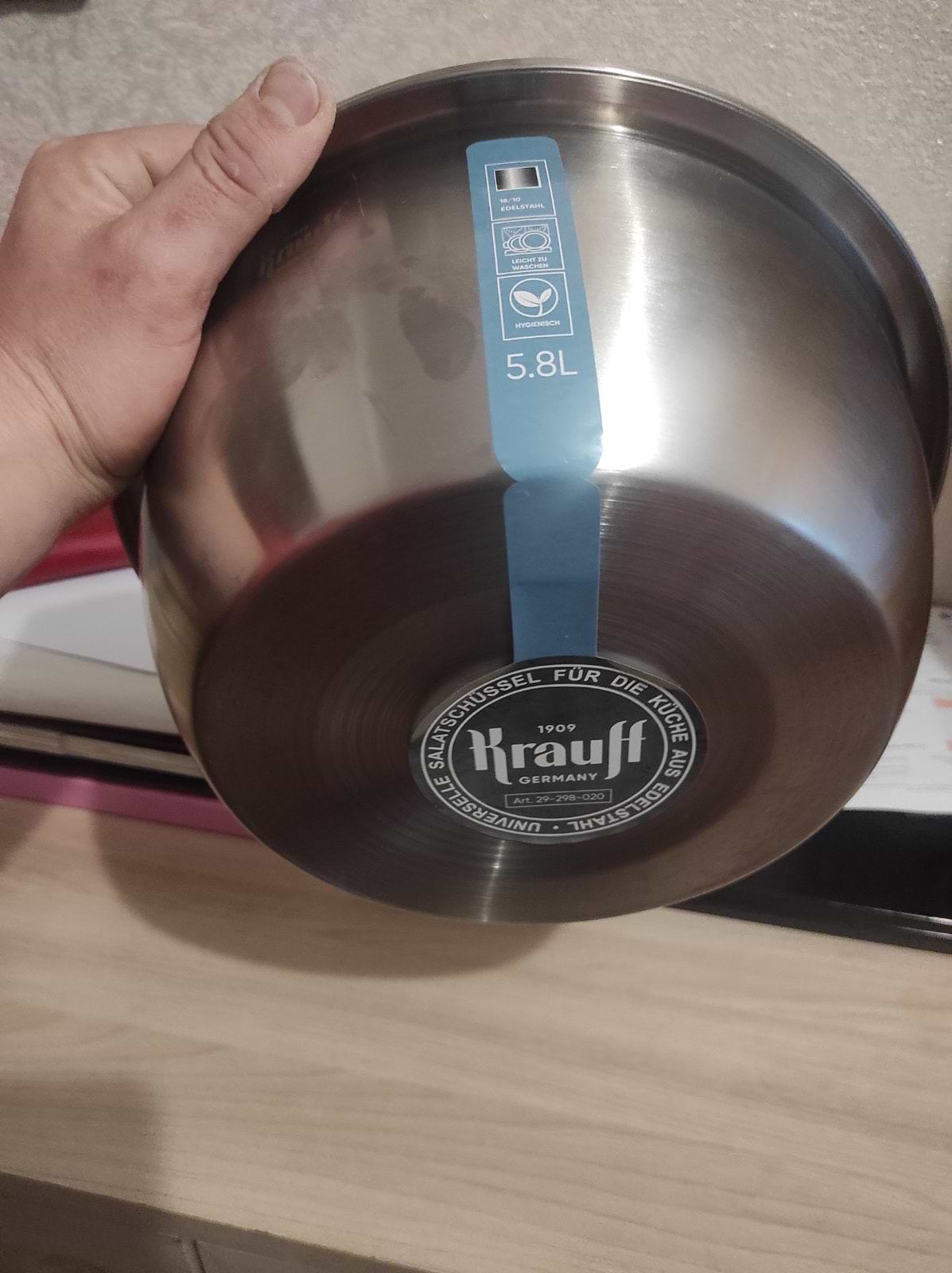 .Миска суперова.Велика, має дно де добре можна замісити тісто.Якість миски та всієї лінії Krauff класне. То вже маю заказувати і інші розміри мисок бо вони бомбезні
