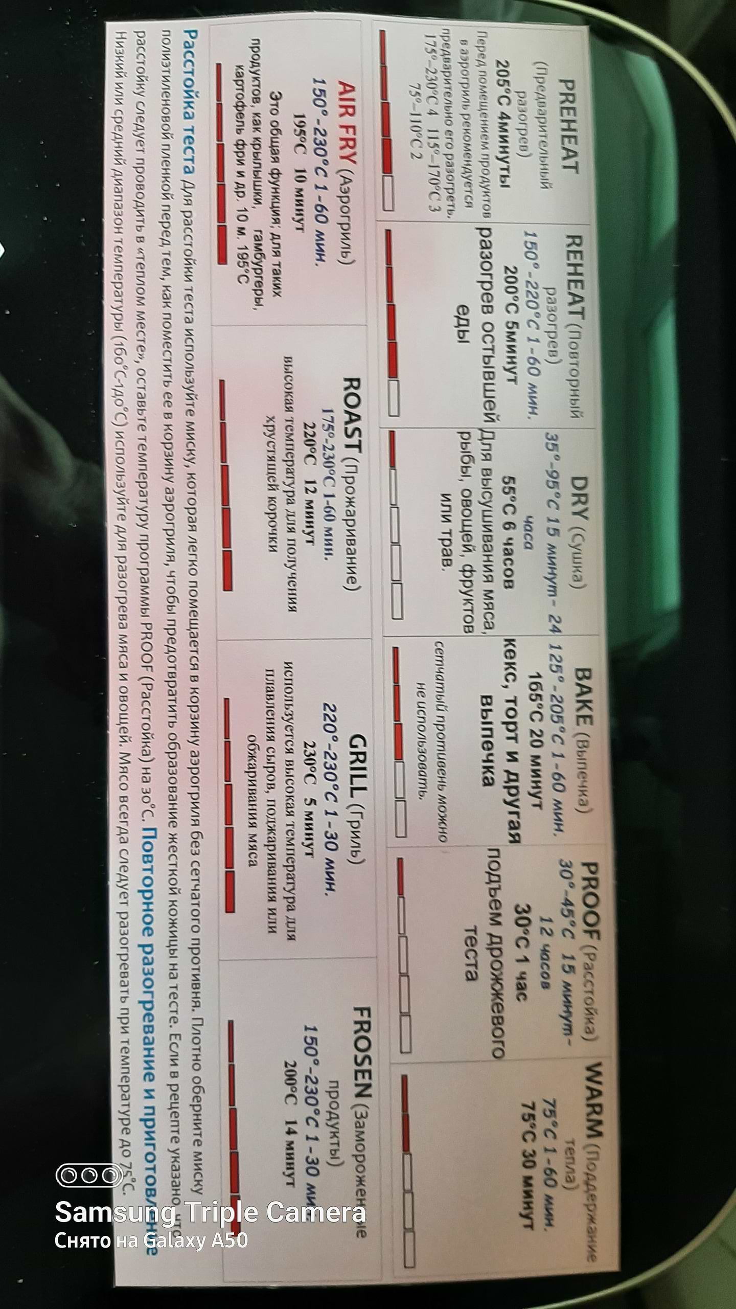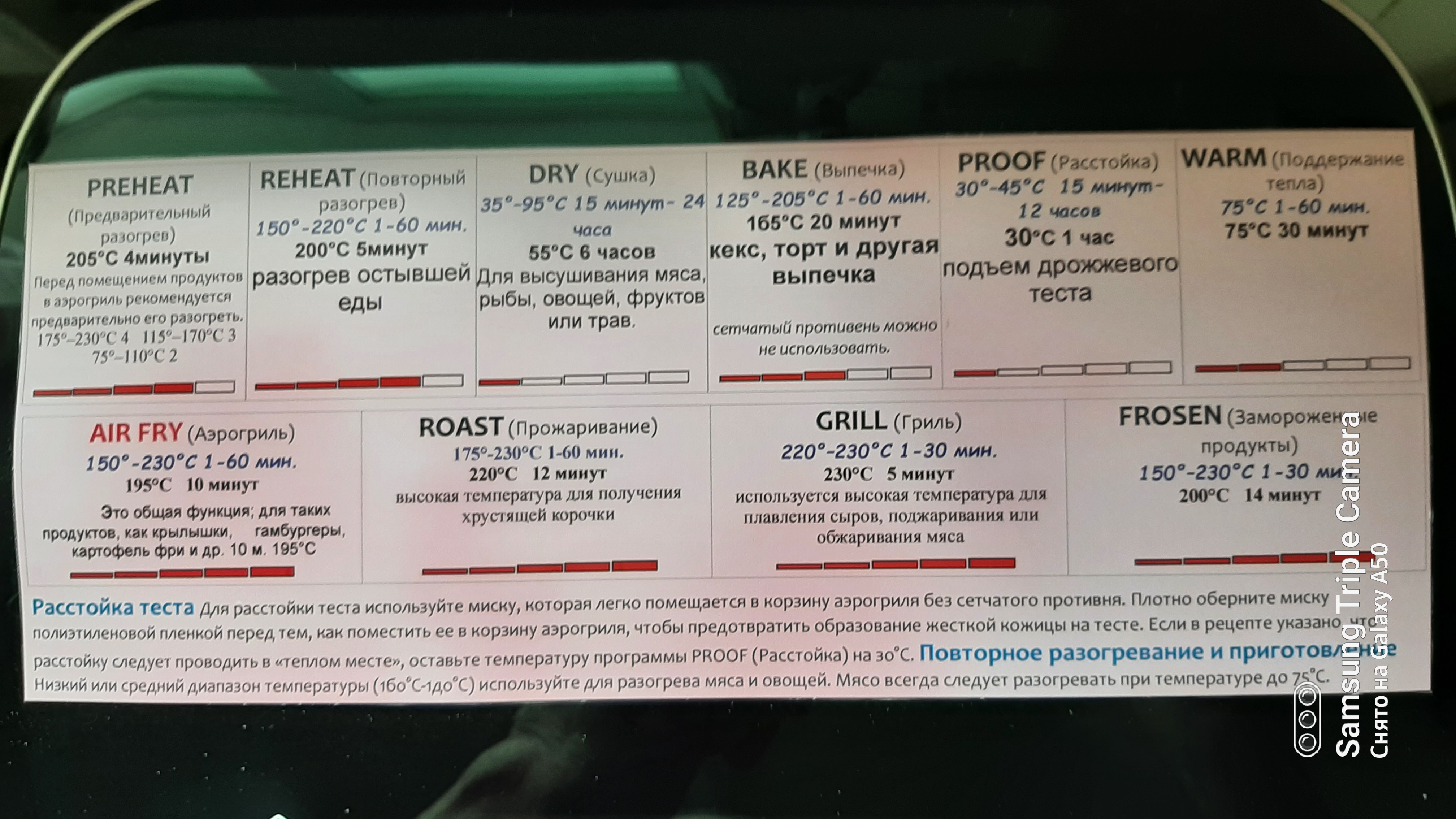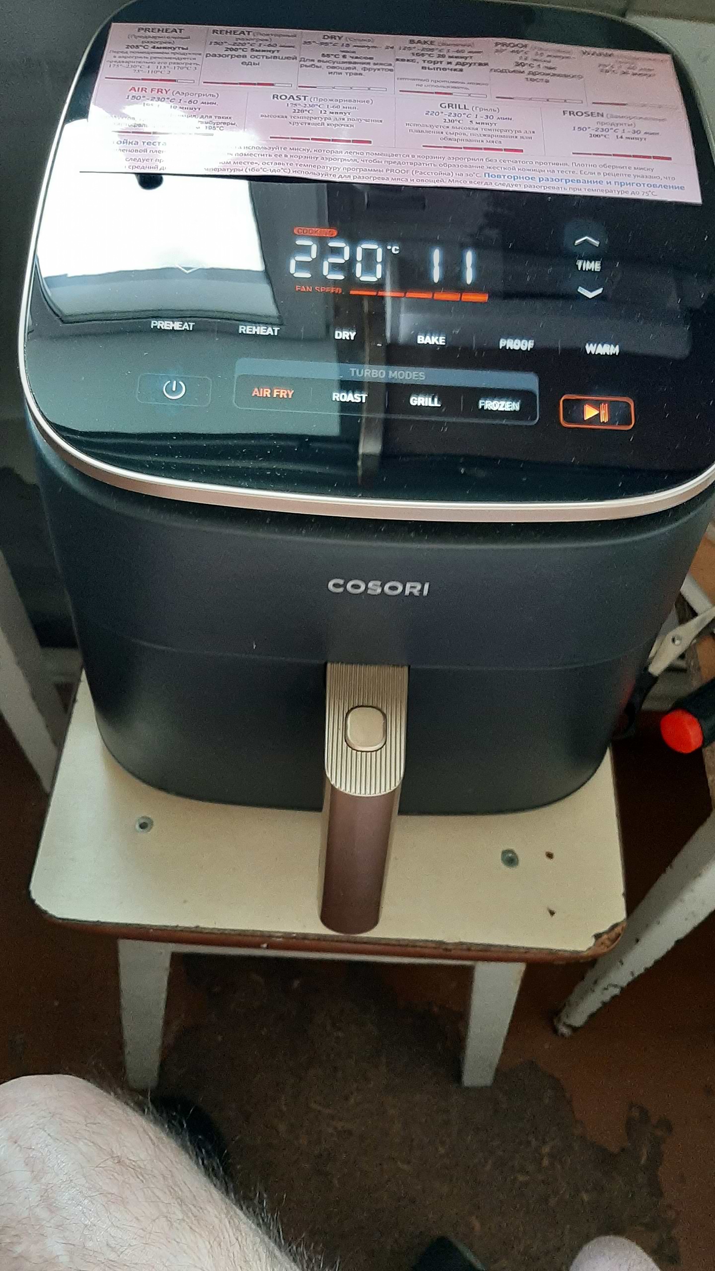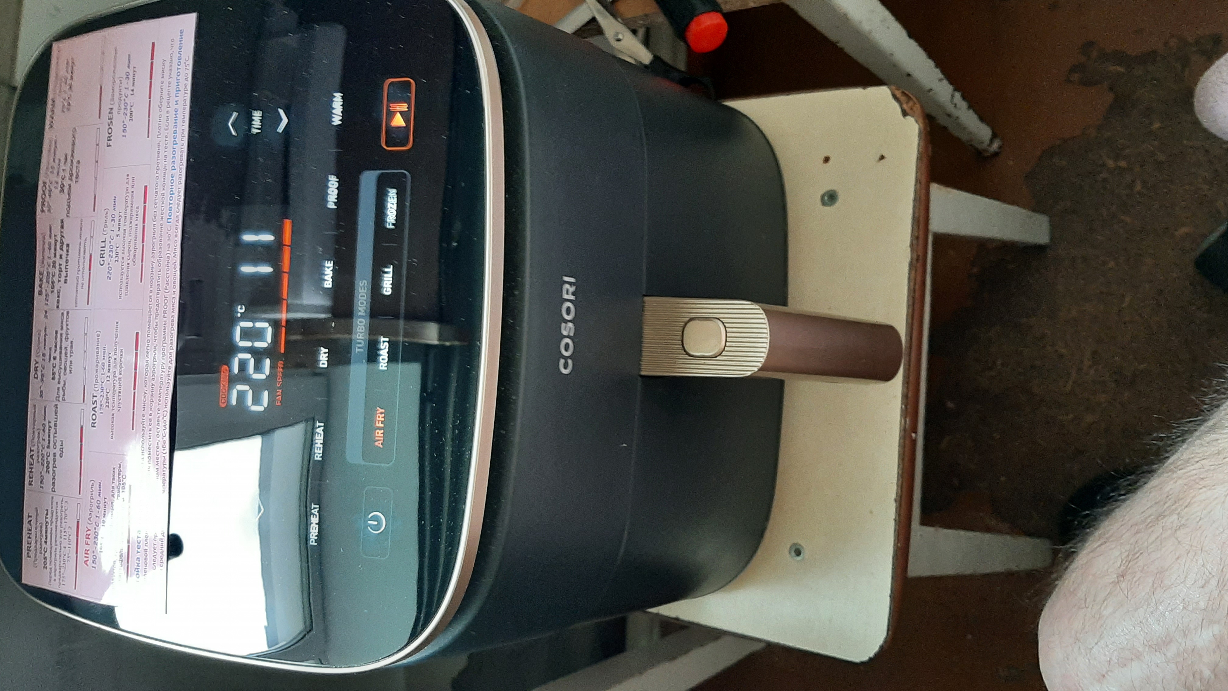 Основное отличие этого аэрогриля - двигатель постоянного тока, с разной скоростью вращения. Если в обычном аэрогриле мы оперируем временем и температурой, здесь можно еще выбирать скорость потока горячего воздуха. Например при выпечке скорость 3 - не подгорит. Так же использую при запекании крылышек, более мягко на последнем этапе образуется корочка. На фото шпаргалка, где видны все режимы.