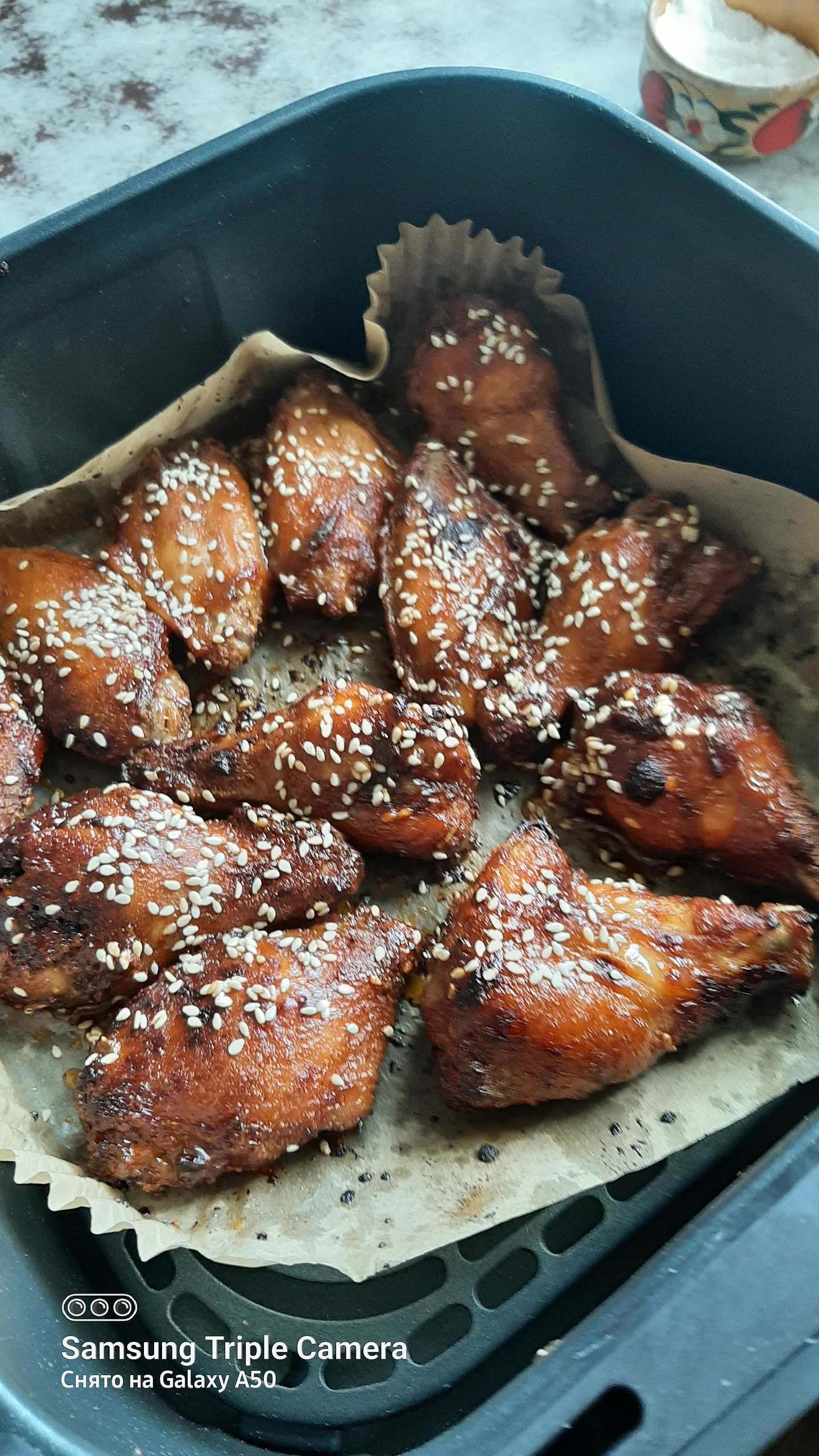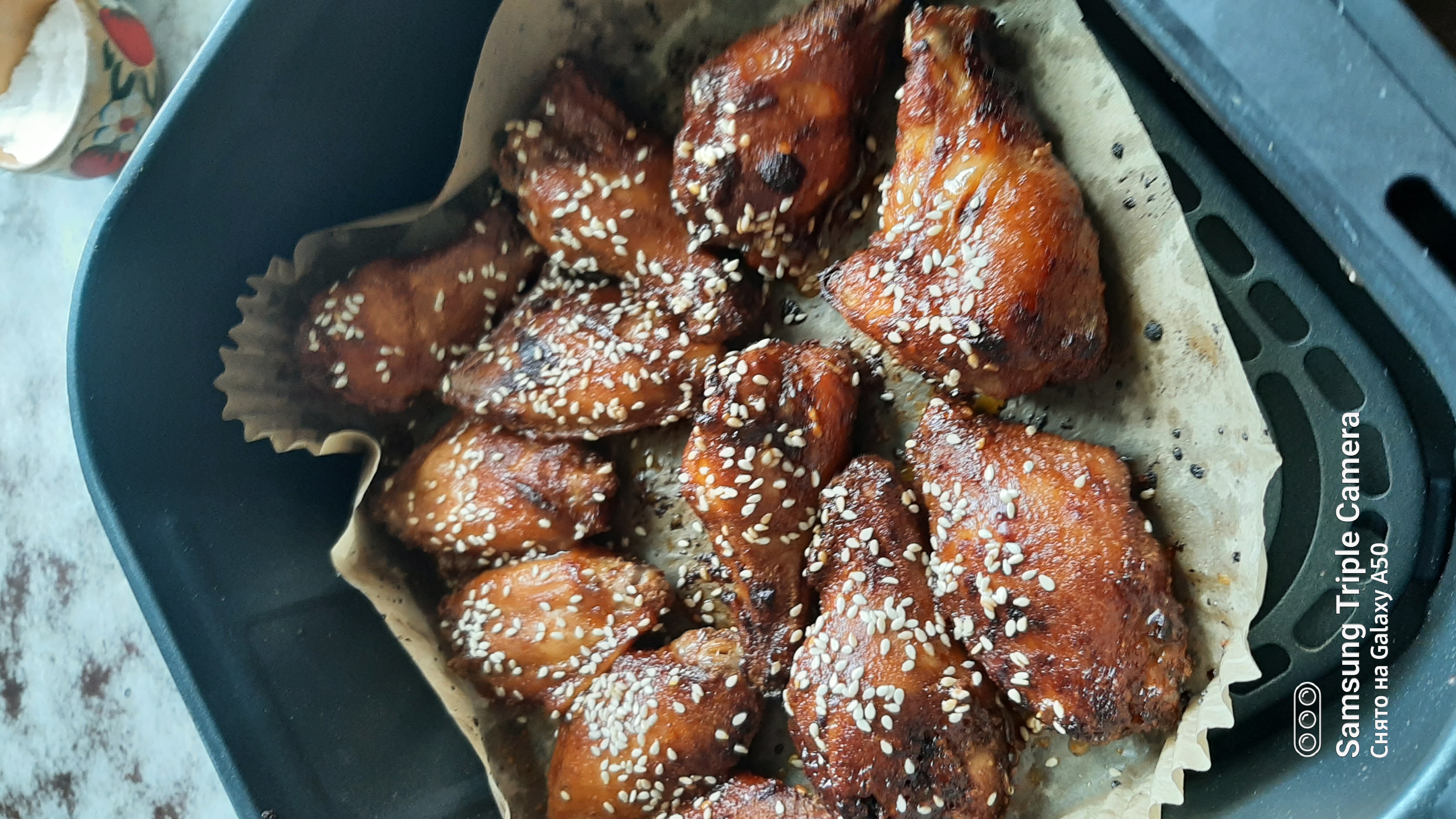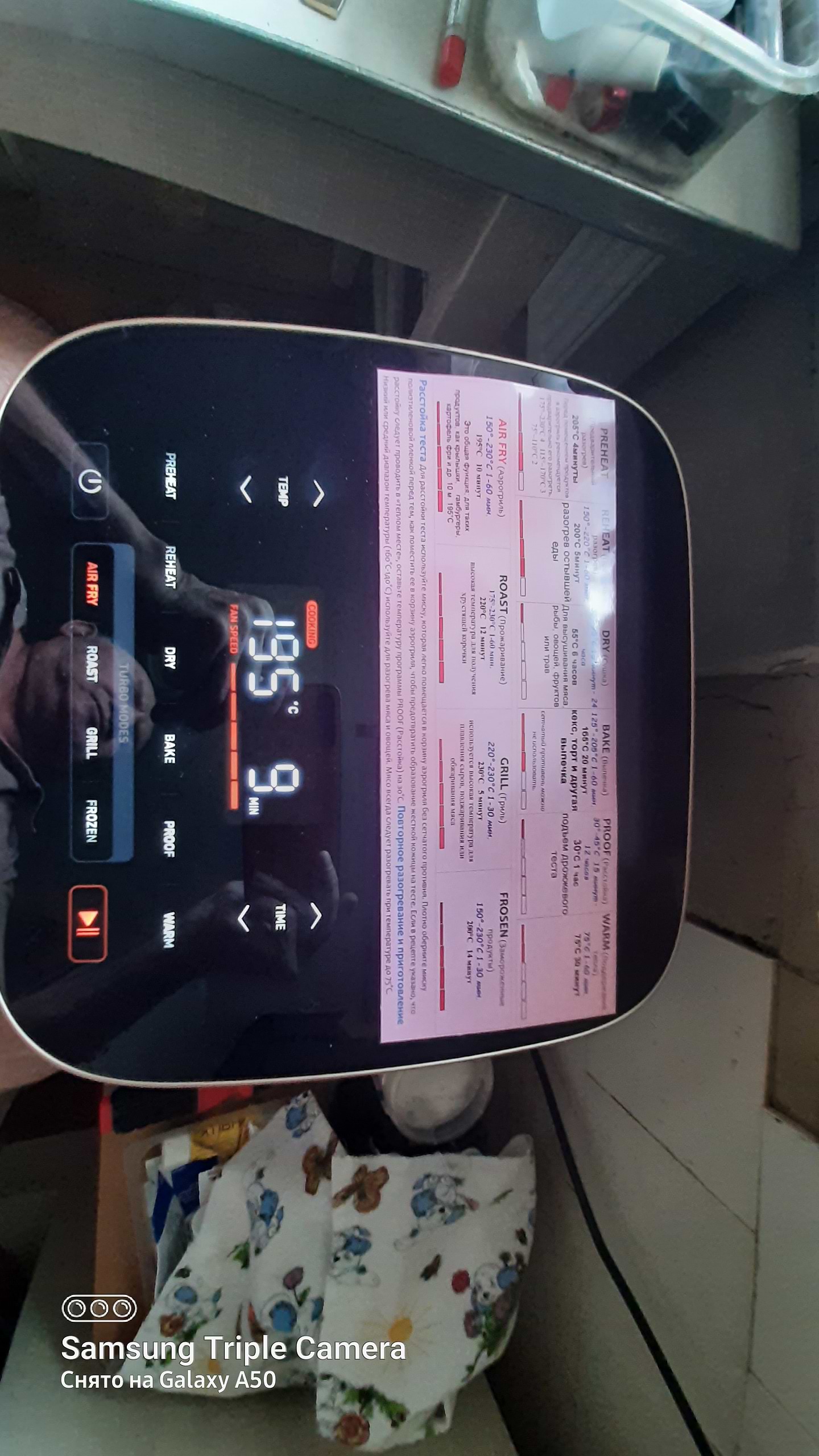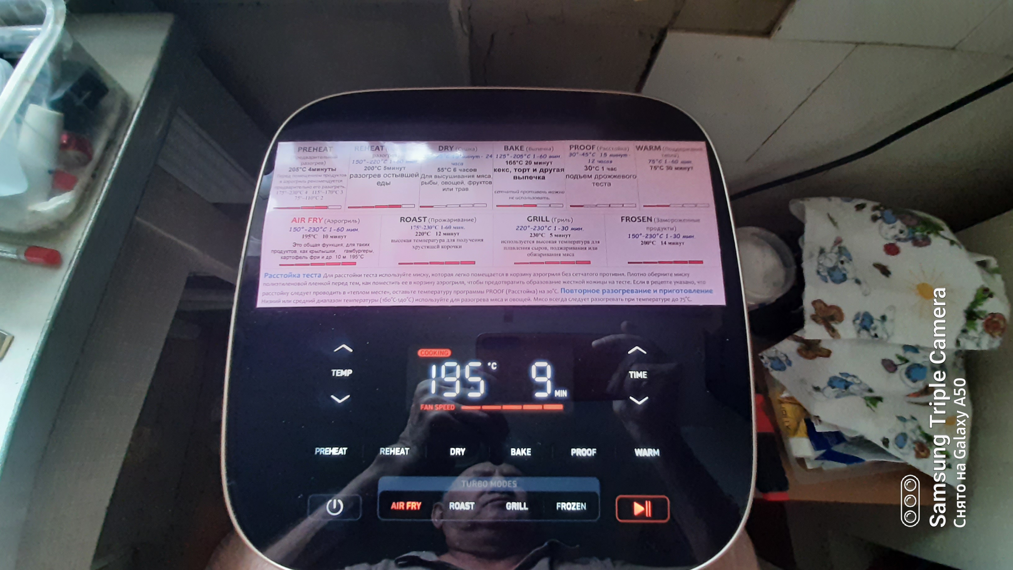 Основное отличие этого аэрогриля - двигатель постоянного тока, с разной скоростью вращения. Если в обычном аэрогриле мы оперируем временем и температурой, здесь можно еще выбирать скорость потока горячего воздуха. Например при выпечке скорость 3 - не подгорит. Так же использую при запекании крылышек, более мягко на последнем этапе образуется корочка. На фото шпаргалка, где видны все режимы.
